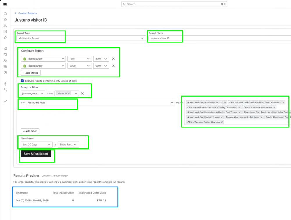 - Filter by Justuno_source equals Visitor ID AND Attributed Flow equals and select all your abandonment flows.