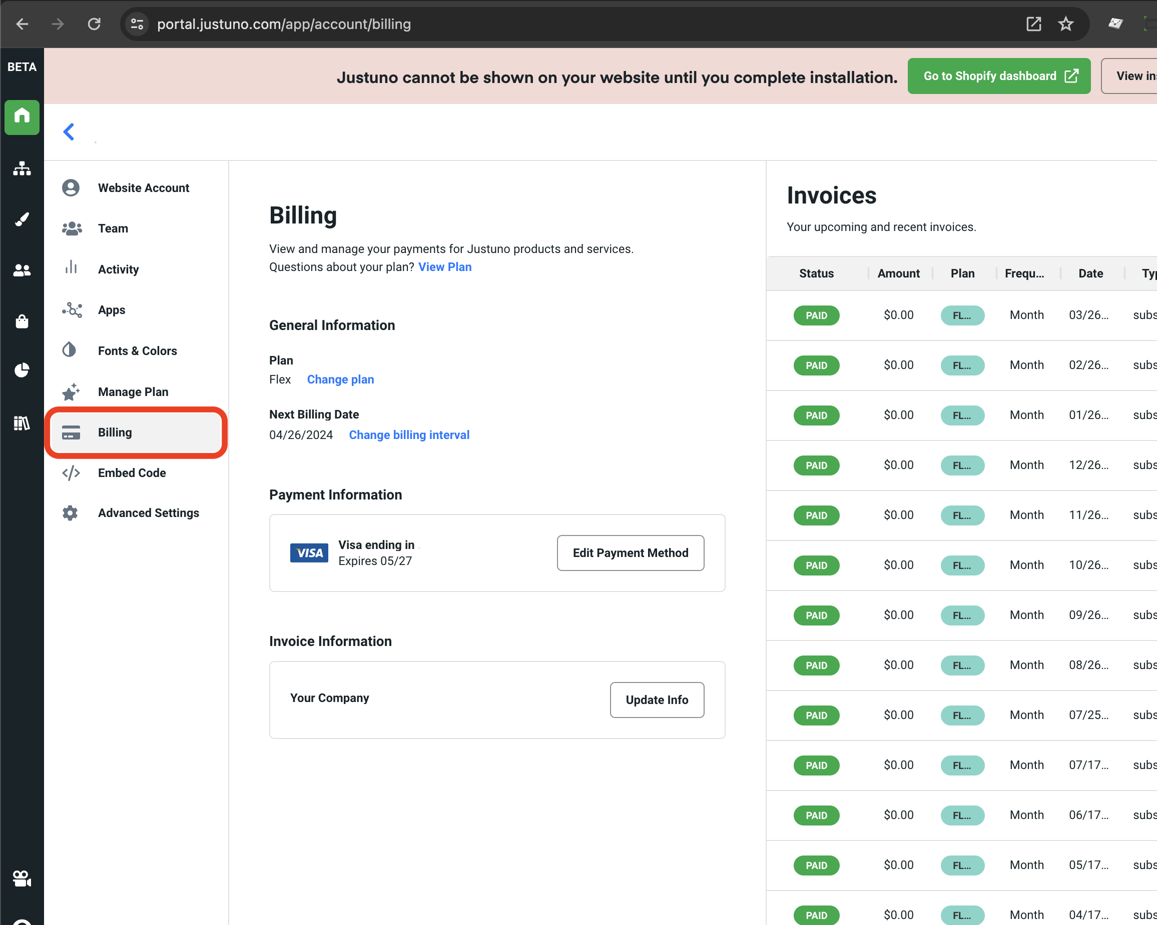 In the billing section, you will be able to manage payment methods on file as well as access previous payment details and invoices.