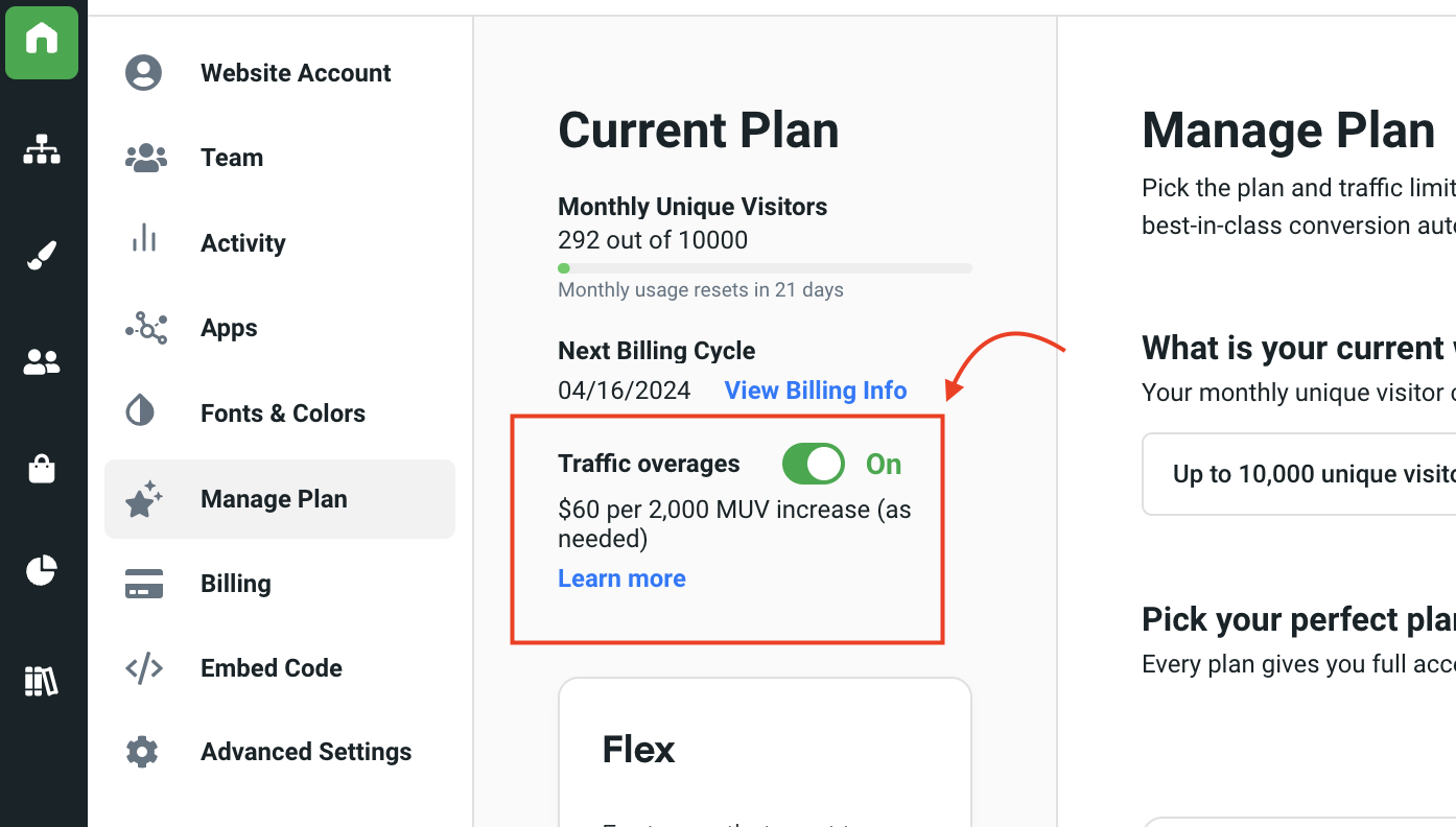 This section allows for you to manage the plan your account is on as well as your traffic overage setting.