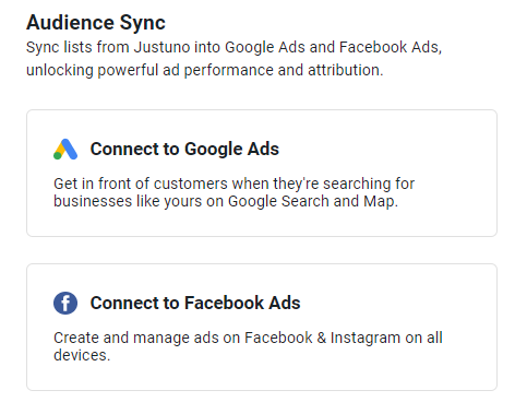 Profiles can be synced from third-party integrations like Google and Facebook ads. By clicking the options to connect Google Ads or Facebook Ads, we're navigated to the Account -> Apps section of Justuno.