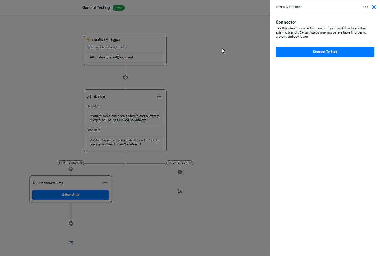 Example Use Case: If a visitor abandons their cart, connect them to a follow-up workflow that sends a reminder after 30 minutes.