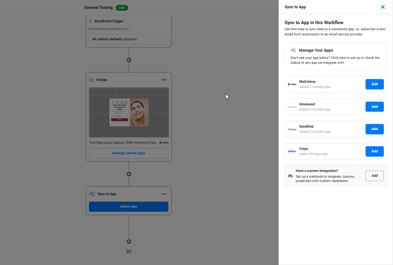 Justuno’s Advanced Workflow Actions allow you to further refine customer journeys by integrating external data, syncing visitor actions with third-party apps, and dynamically updating user profiles. These advanced tools help create highly personalize