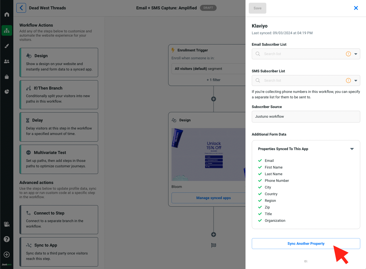 - Connect your Klaviyo account to Justuno (learn how to do that here). Once Klaviyo has been authenticated, go to your desired workflow, and click Edit Workflow. Once in the workflow builder, click the design step containing the form you wish to sync.
