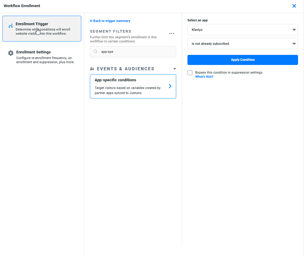 To do this, add the App-Specific Condition and select Klaviyo. Then set the evaluator to "Is not already subscribed." It should look similar to the image below when you are done.