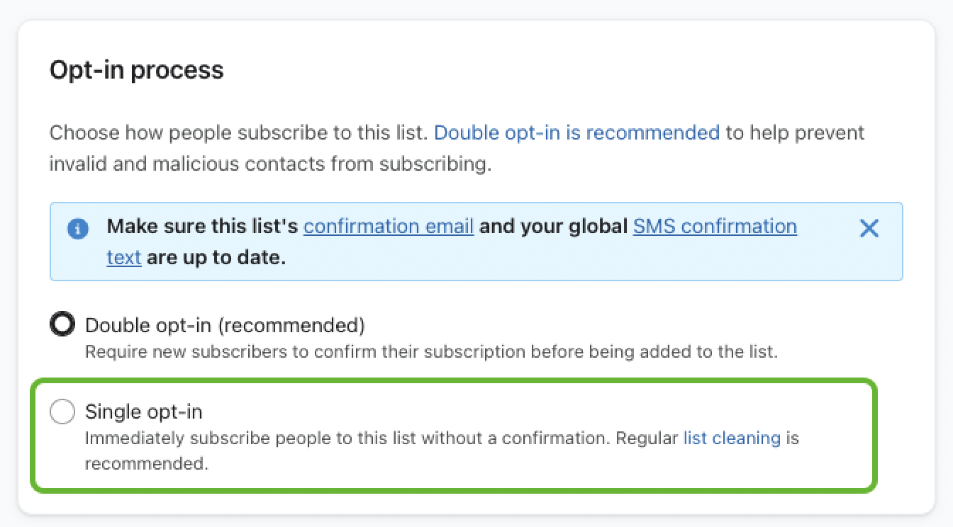 - If you want the profile to be marked as "subscribed" for SMS Marketing in the UI, your list has to have a single opt-in enabled. Note that if the profile doesn't have "subscribed" status for SMS marketing, Klaviyo will not allow you to market to them.