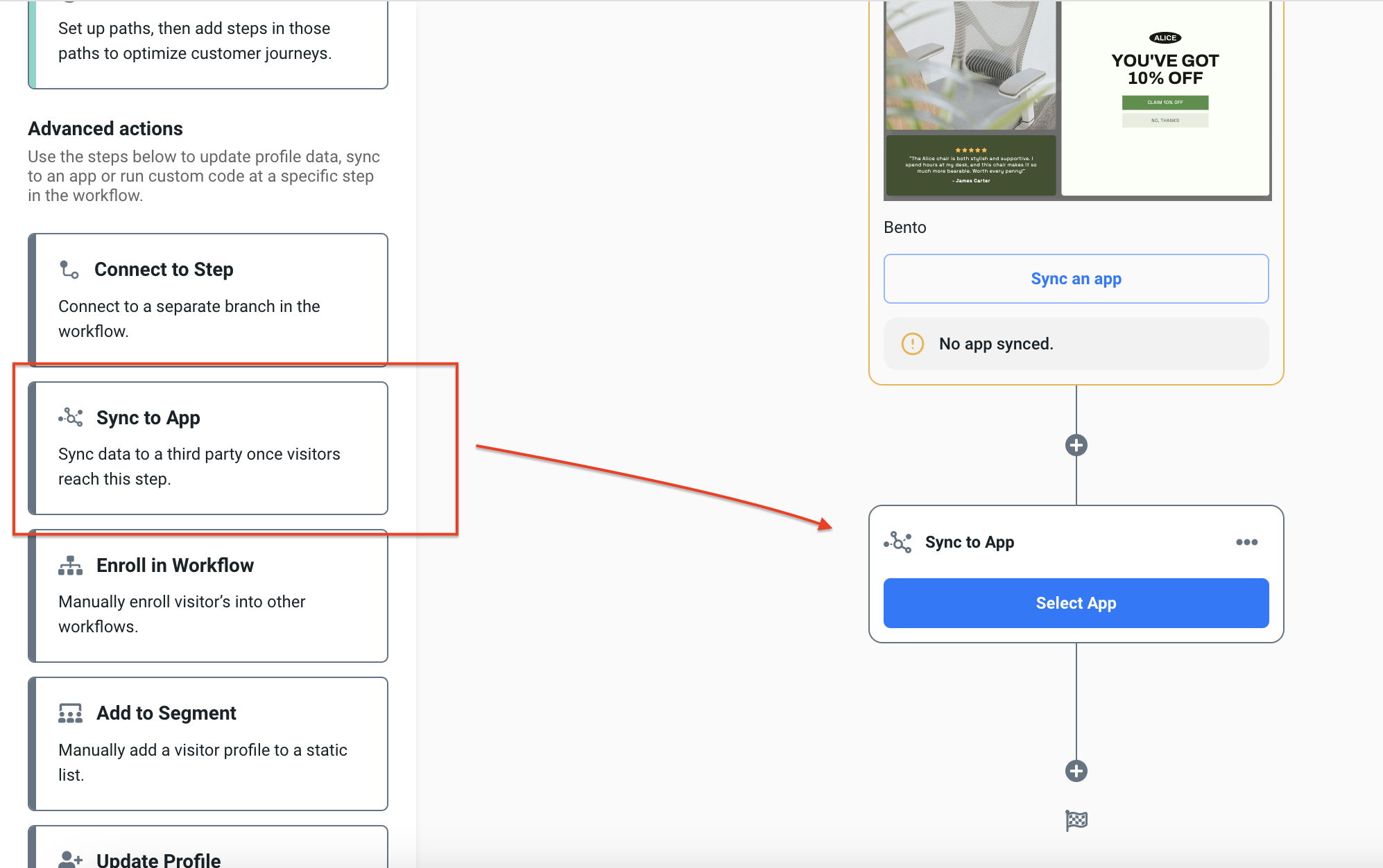 Note: To send contact information to multiple lists you will need to use multiple Sync to App workflow steps. Drag the Sync to App tile to the workflow and click Select App to subscribe contacts and properties to additional lists.