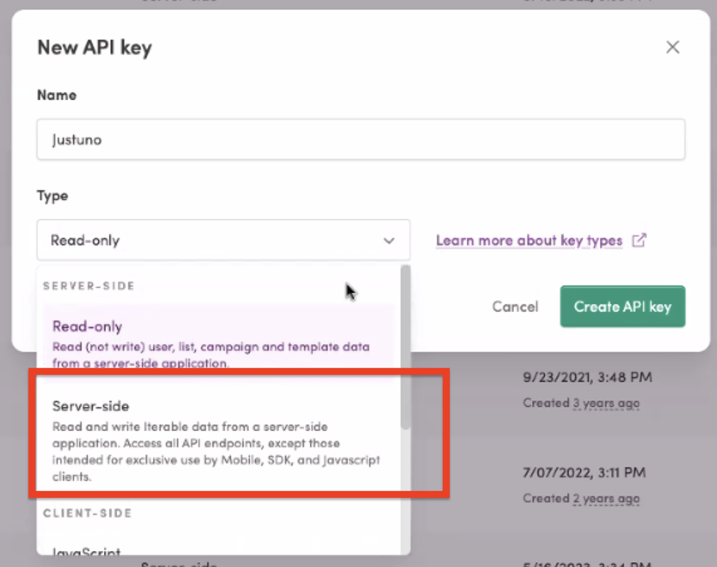 - When creating an API key, it is important to create a Server-Side type API key