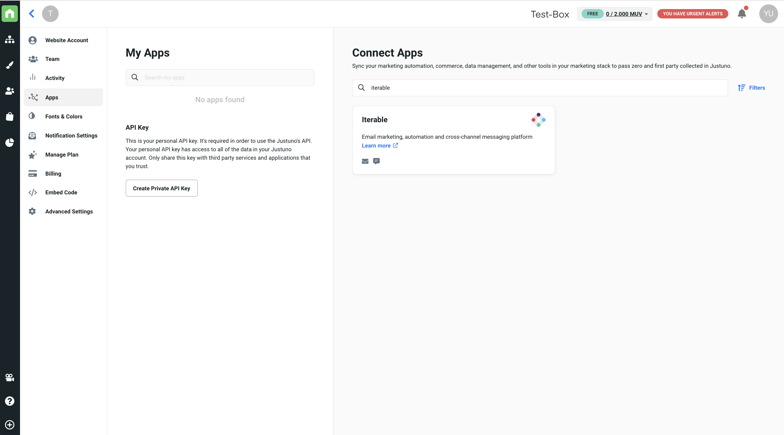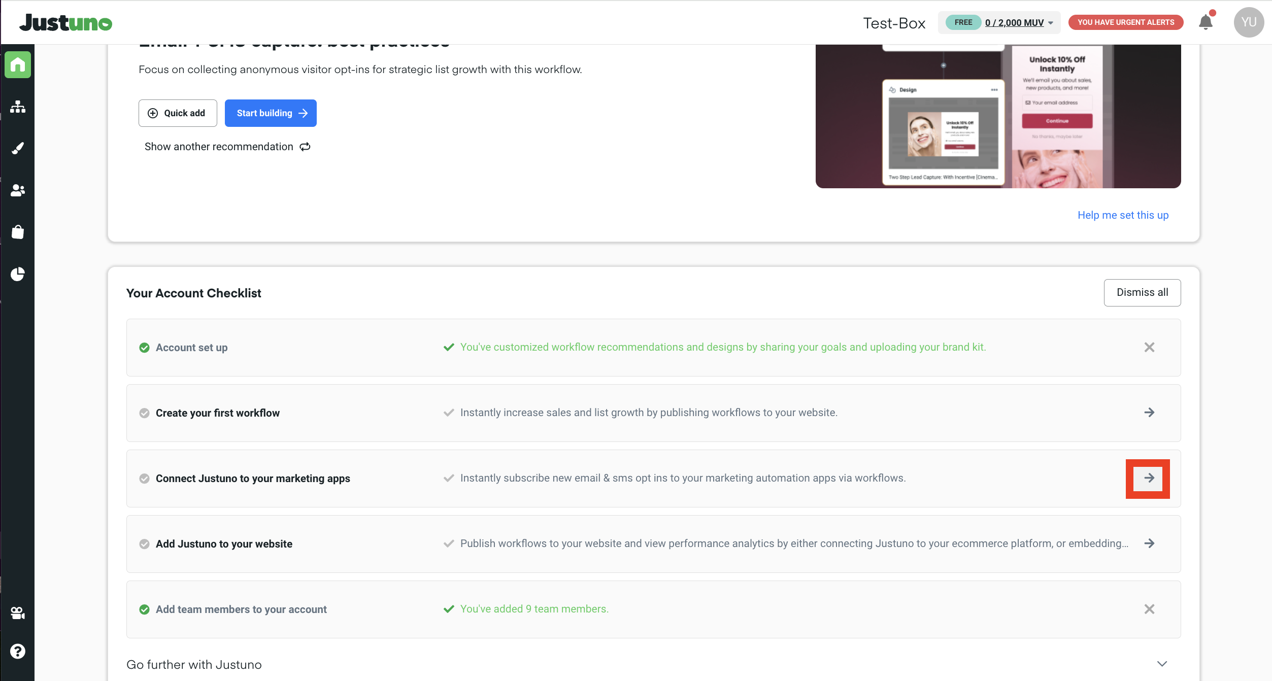 1. Once you have created the API key on Iterable, you can connect the Iterable app in your Justuno account. In the Account Checklist on the Homepage of your Justuno account, you can click on Connect Your Apps, which will redirect you to the Apps section.