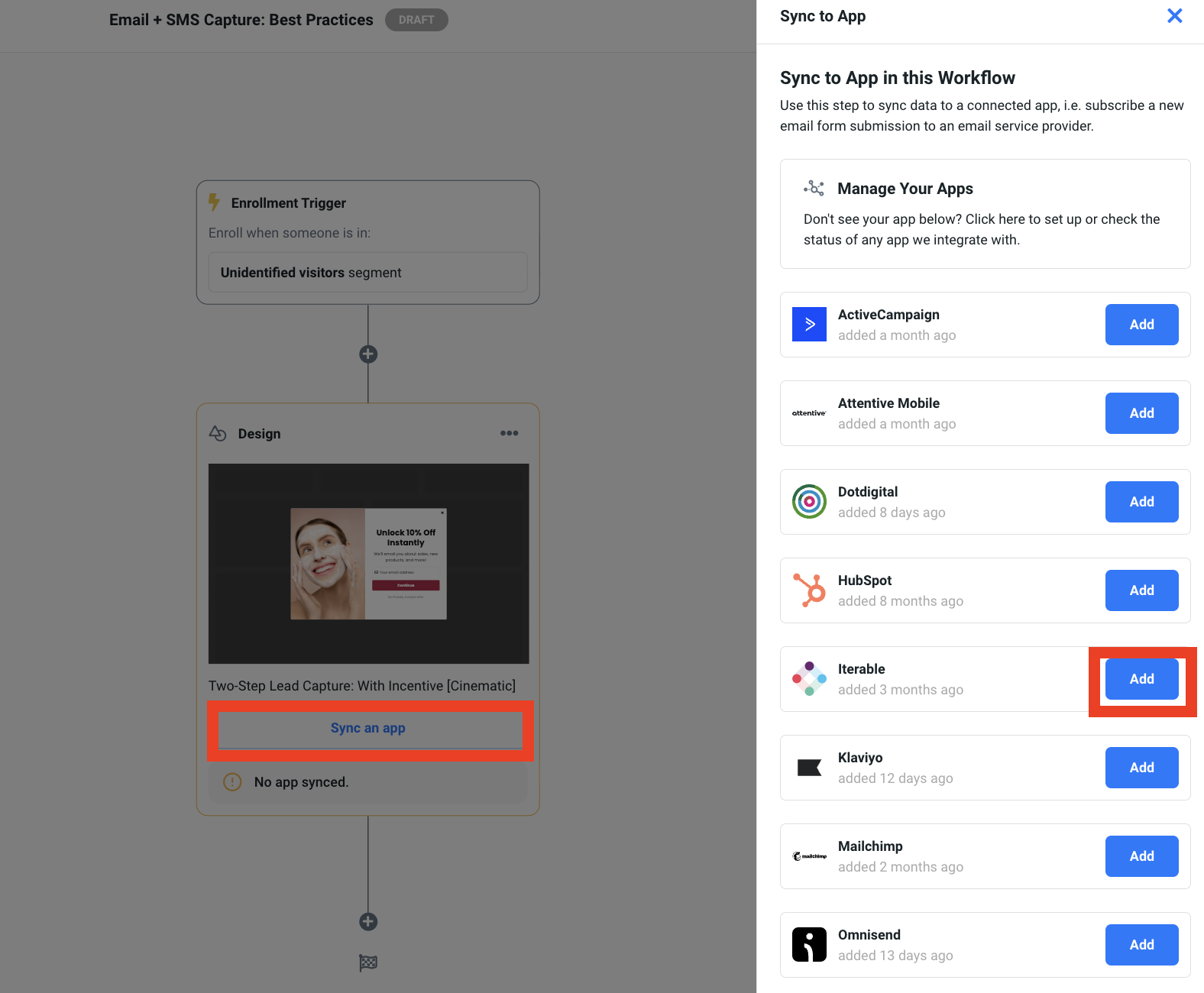 4. In the design step of the workflow, select the Sync to App option. In the side menu, find the Iterable app and click on Add.