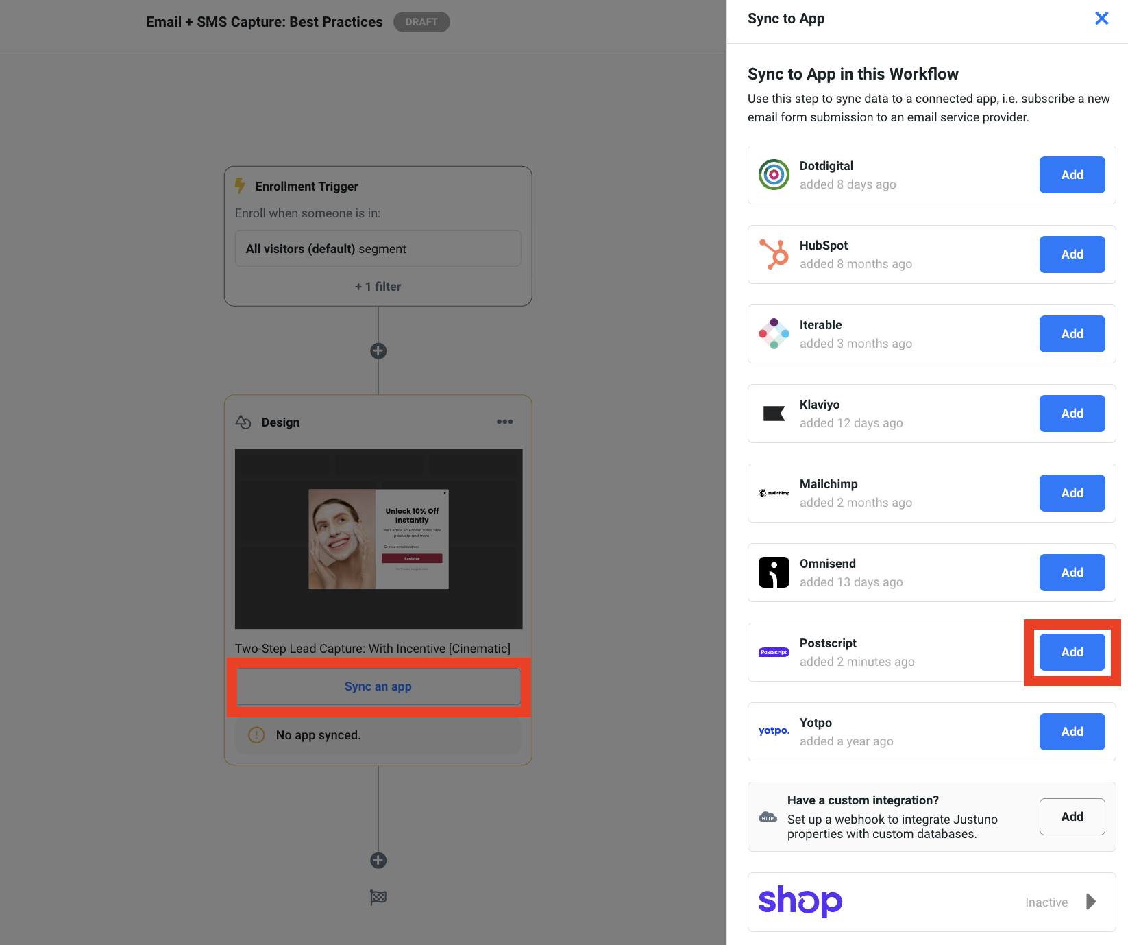 4. In the design step of the workflow, select the Sync to App option. In the side menu, find the Postscript app and click on Add.