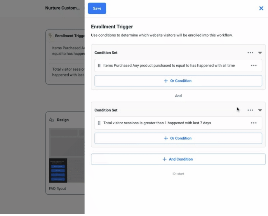 - Once the Workflow is added to your account - you can click on the Enrollment Trigger tile to update the Enrollment Trigger to fit your targeting needs or leave it as is. The use case suggests that the following conditions be used to start targeting a broader audience.