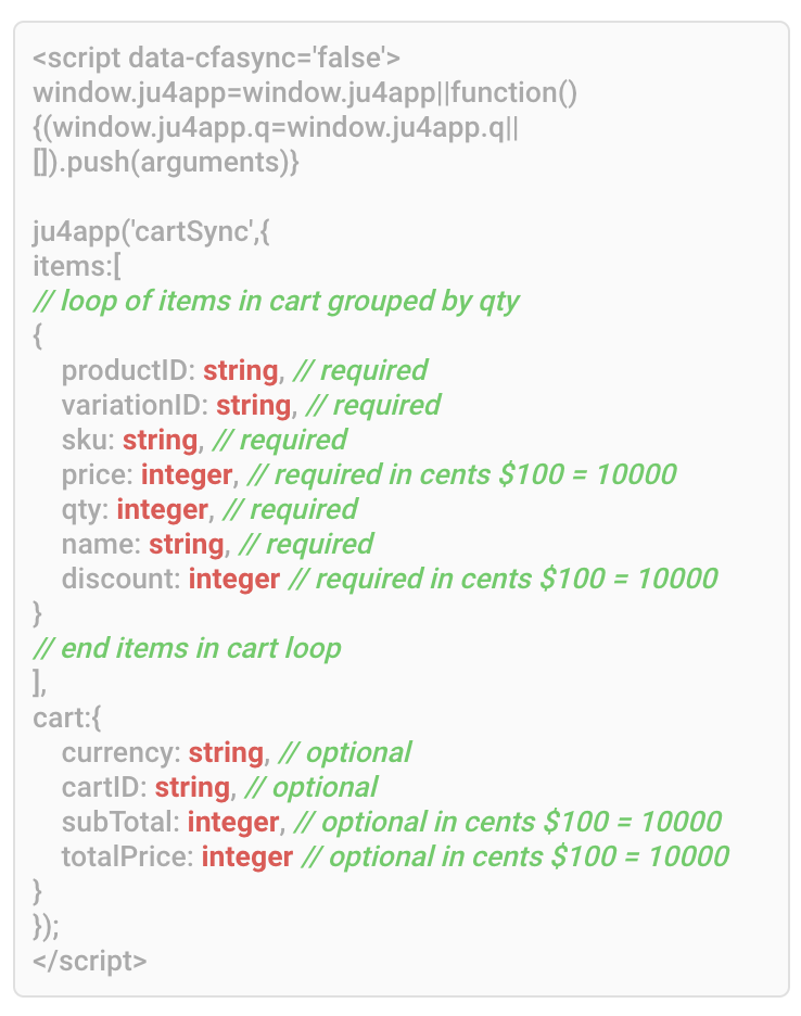 This template illustrates how to tell our system that there is a list of products in the users cart via that first JSON array. So you would loop through in your shopping cart code to produce one JSON object for each item in the cart there.