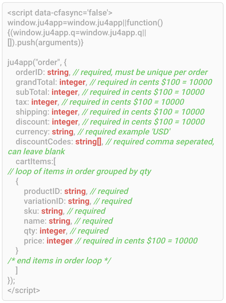 This template illustrates how to tell our system about the order summary info and what products were in the order via that JSON array. So you would loop through in your post checkout page code to produce one JSON object for each item in the order there.