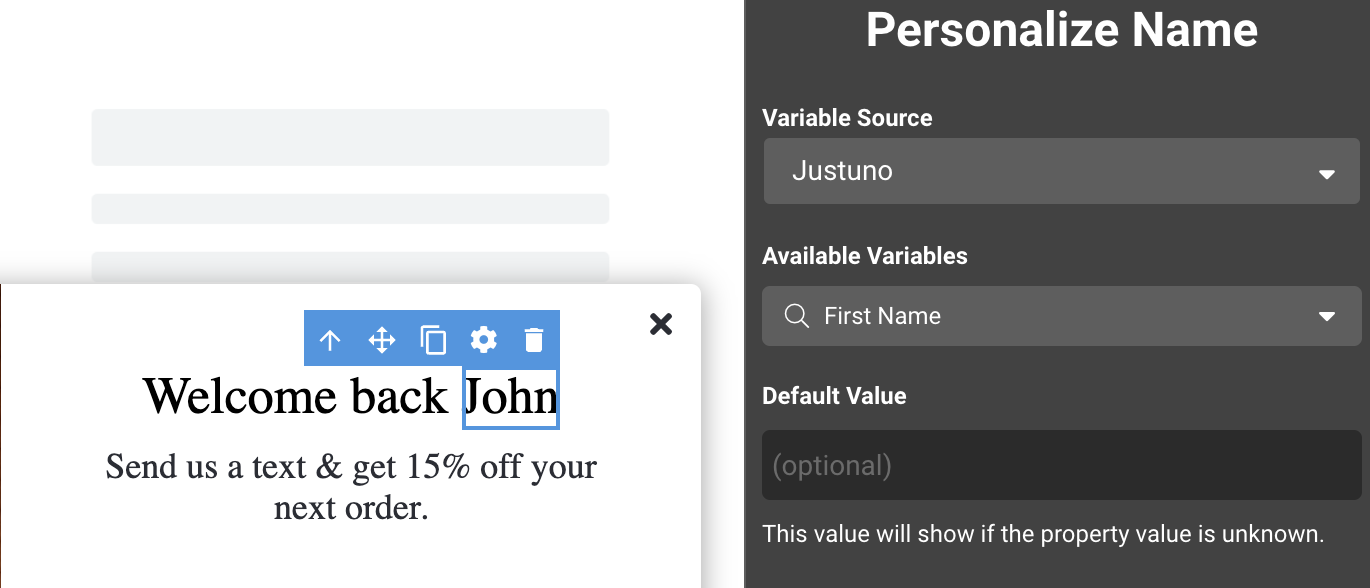 Justuno's design studio lets your personalize content of a design by creating tokens that are automatically replaced with the selected profile property's value at run-time.