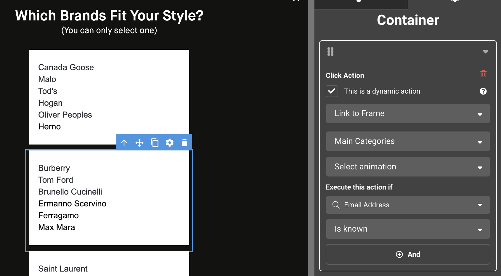 You can also utilize profile properties to make dynamic click actions on elements. For instance, you may want a multi-step survey or quiz to go to specific frame when they click the continue button based on answers to a previous question.