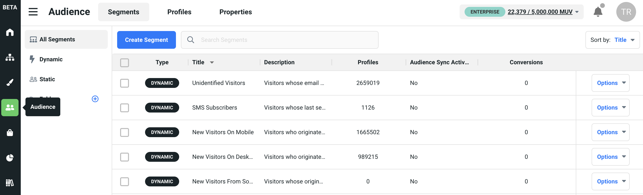 In the audience section you can create dynamic segments using a combination of conditions. These segments will automatically add and remove profiles to them as profile match or no longer match the segment criteria. Dynamic segments can be used in workflow enrollment triggers but are also a powerful way to run custom reporting or to export profiles.