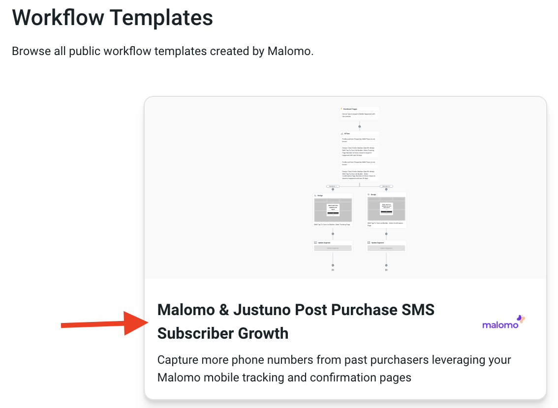 - Go to the Malomo Partner view and add this workflow to your account: Malomo & Justuno Post Purchase SMS Subscriber Growth