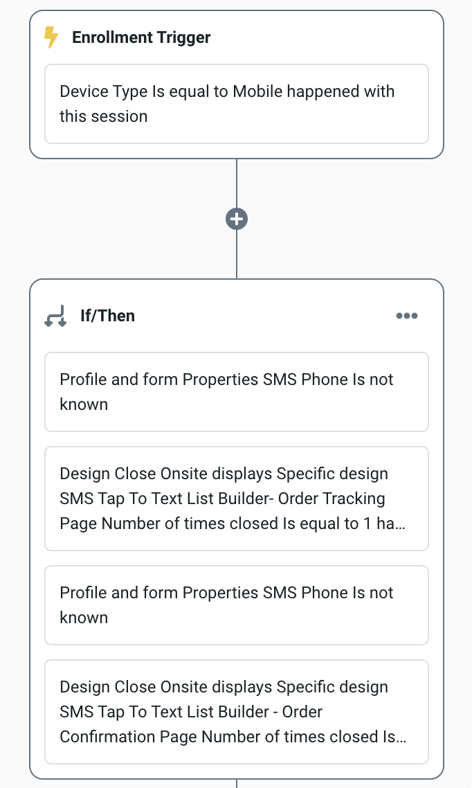 - Once the Workflow is added to your account - you can click on the Enrollment Trigger tile & If/Then tile to update the triggers to fit your targeting needs or leave it as is. The use case suggests that the following conditions be used to start targeting a broader audience.