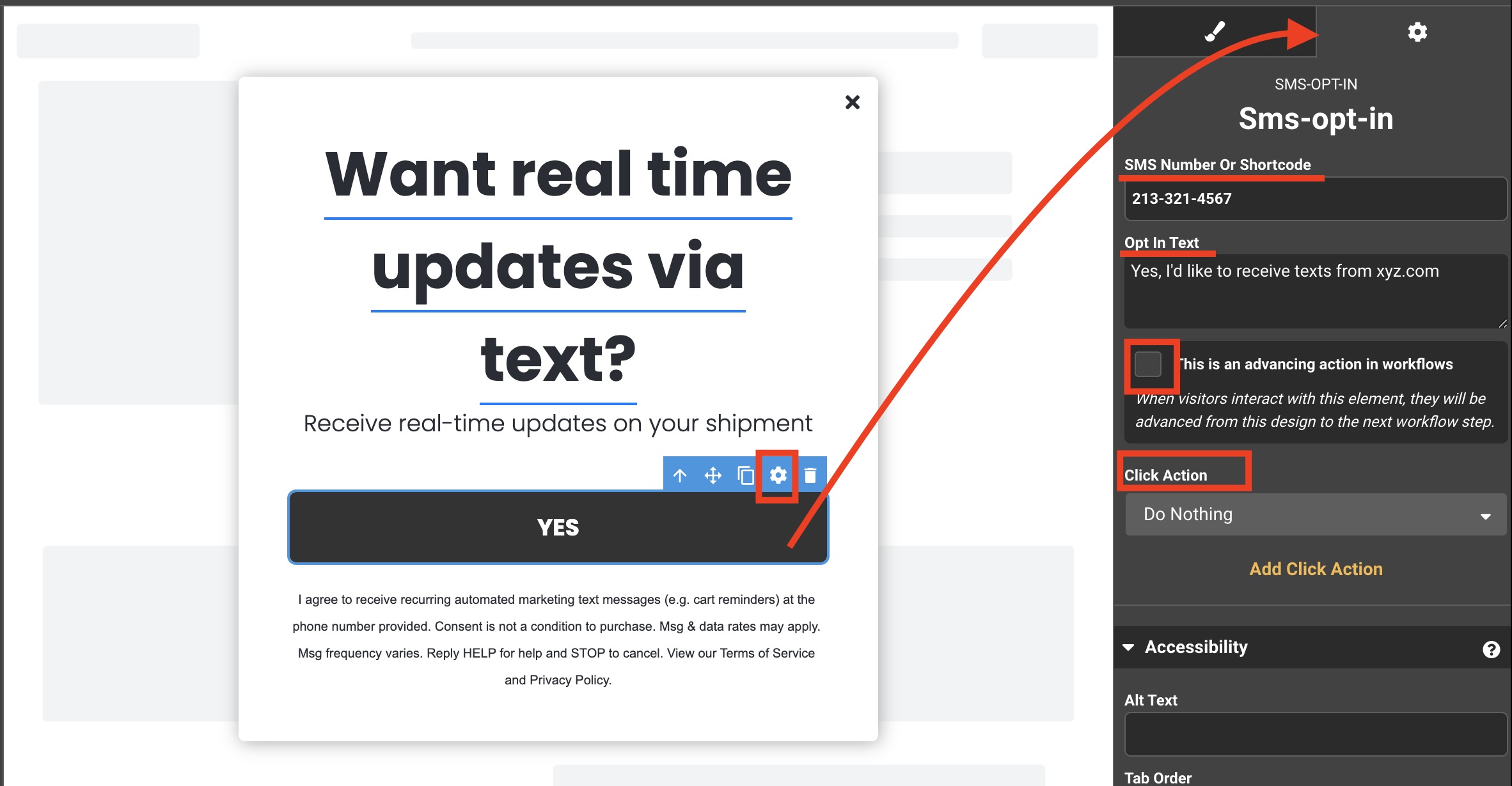 3. Design Updates - click on the design tile update the design template to fit your brand look and voice. And update the CTA Click Actions by adding in your Tap To Text infomation or switching to an input field where a visitor manual enters their number.