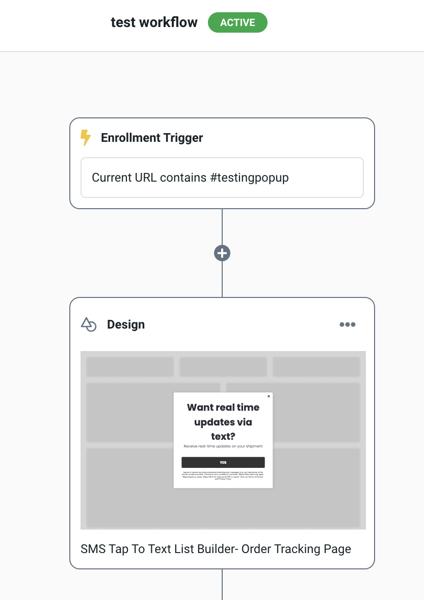 - Live Test - Set up a workflow with the enrollment trigger set to “current URL contains #testingpopup”. Publish this workflow and head to your site incognito. Type in your domain and add in the extension you created in the workflow. Example: yourcooldomain.com/#testingpopup. Refresh the page and you'll see your design.