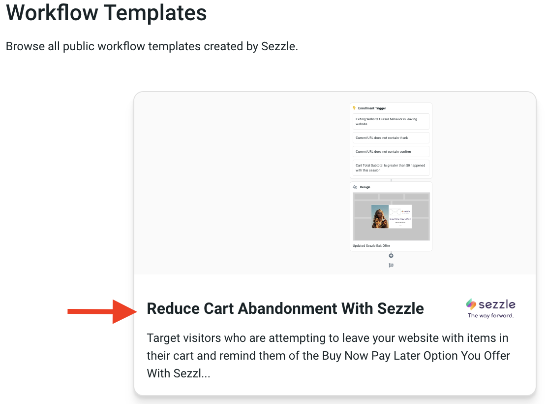 1. Go to the Sezzle Partner view and add this workflow to your account: Reduce Cart Abandonment With Sezzle.