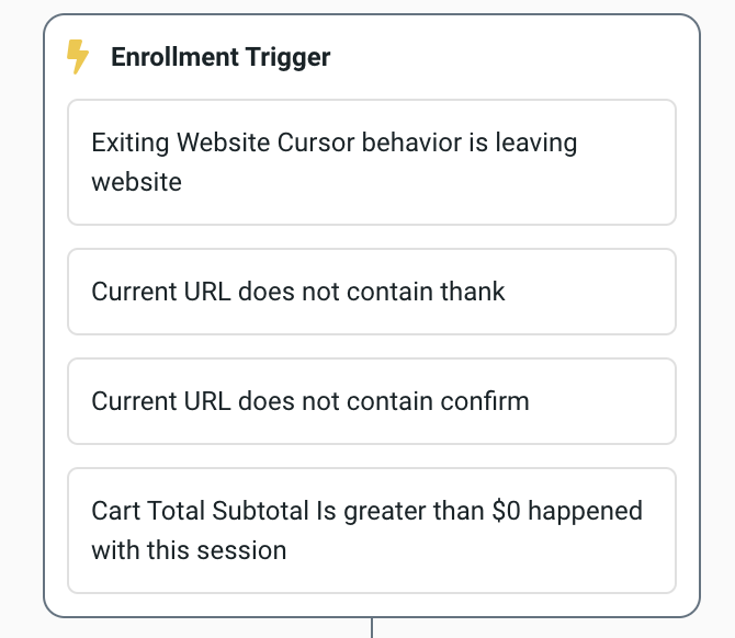2. Once the Workflow is added to your account - you can click on the Enrollment Trigger tile to update the Enrollment Trigger to fit your targeting needs or leave it as is. The use case suggests that the following conditions be used to start targeting a broader audience.