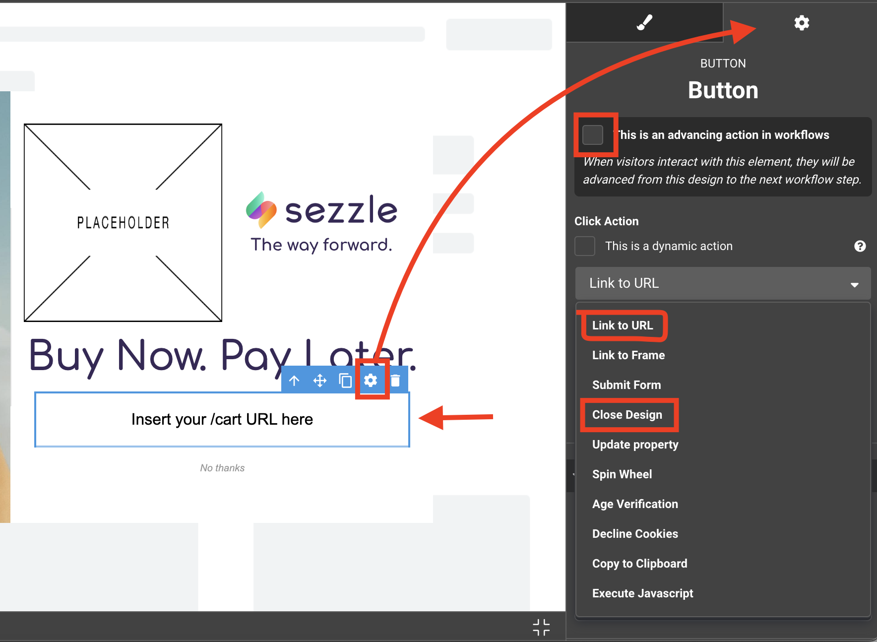 b. Update the CTA Click Actions under Settings by linking to the corresponding URL like cart page for this workflow. We advise having this CTA take someone to their cart to use Sezzle.