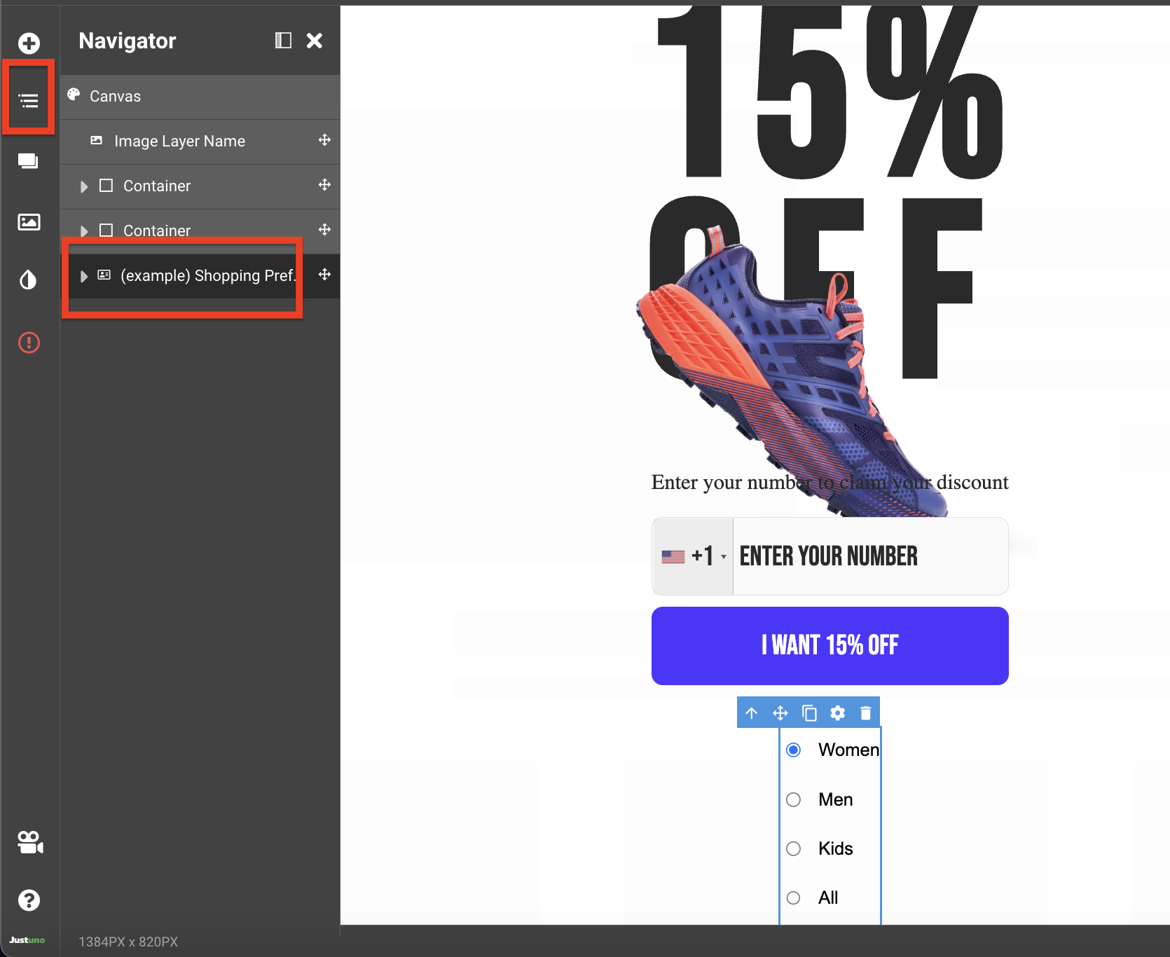 With the property element selected we can edit the layout, font, and design of the options (women, men, kids, all).