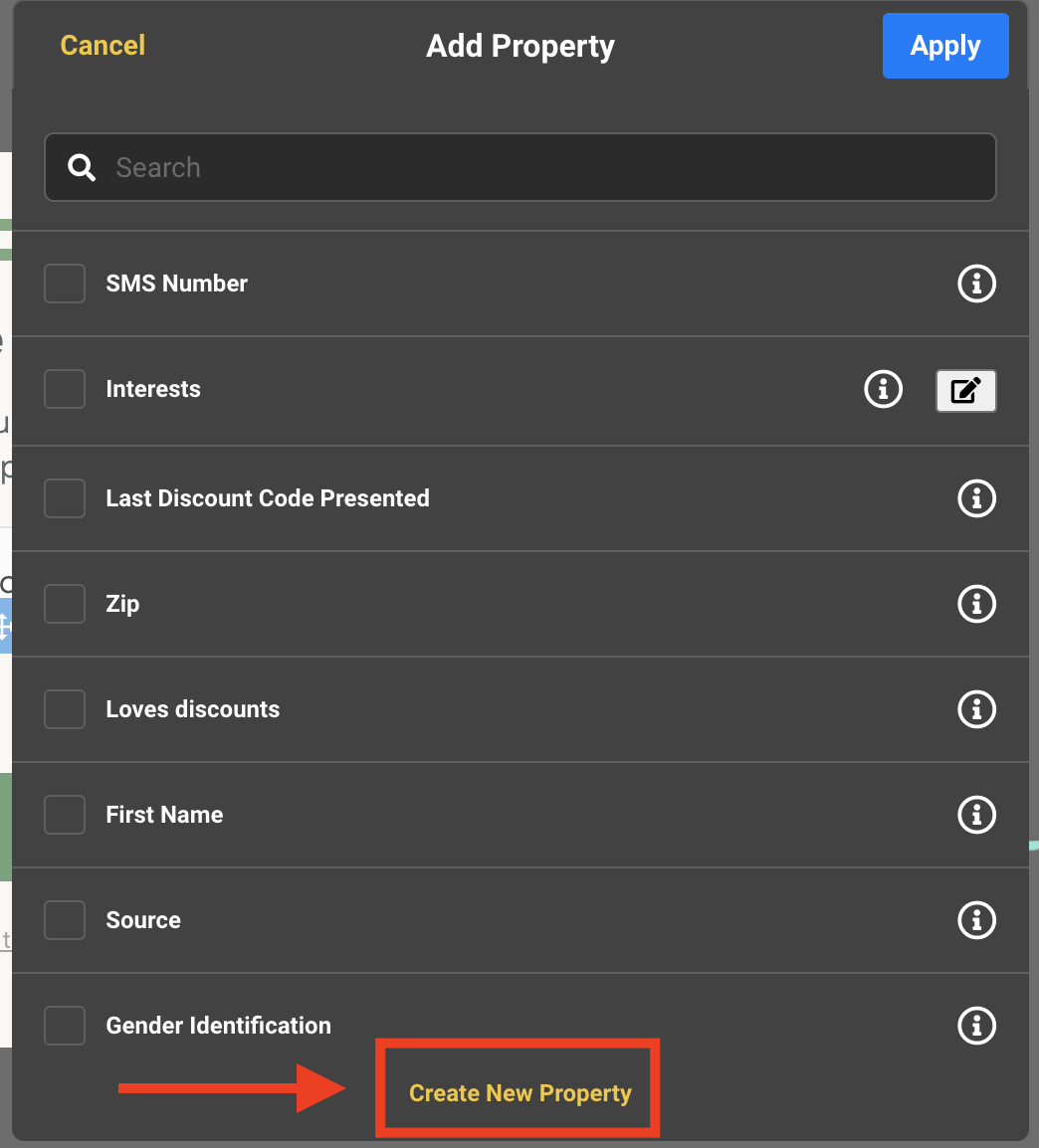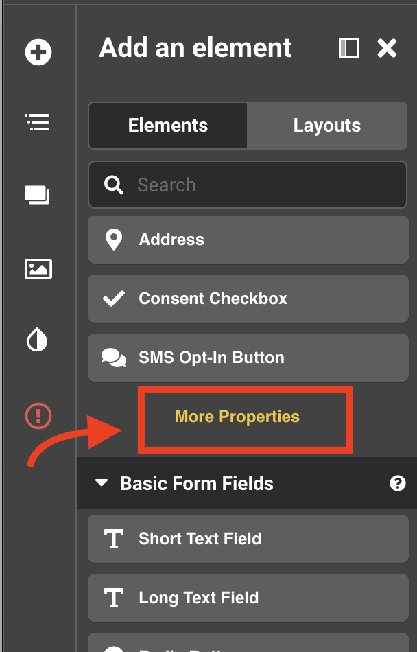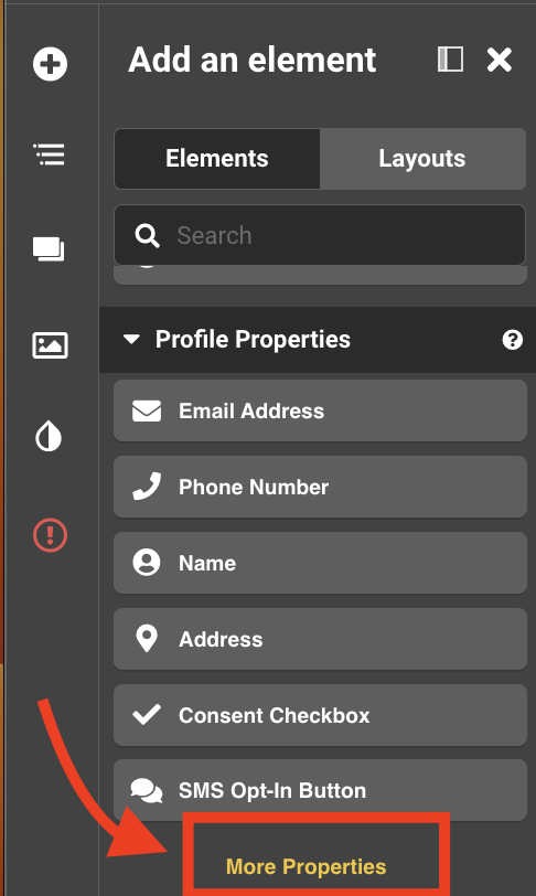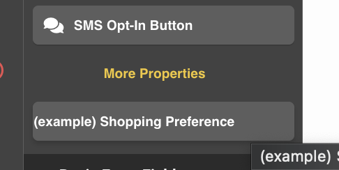 8. Go back to add your new property by clicking on More Properties from the Elements Slide out. New properties will always show up on the bottom of the list.