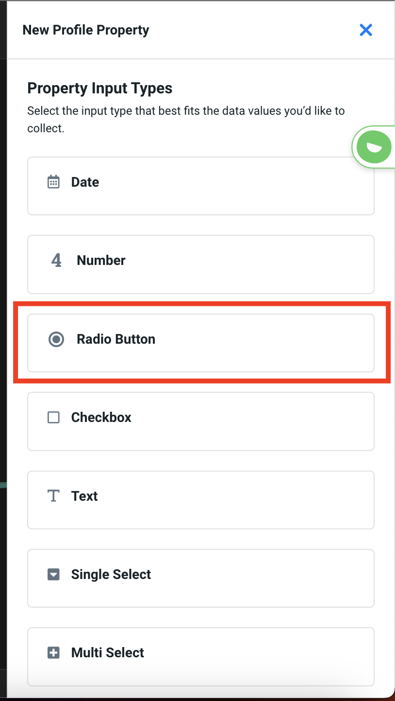 5. Select the radio option from the slide out view. (you could also select any other input type depending on your question format/desired response).