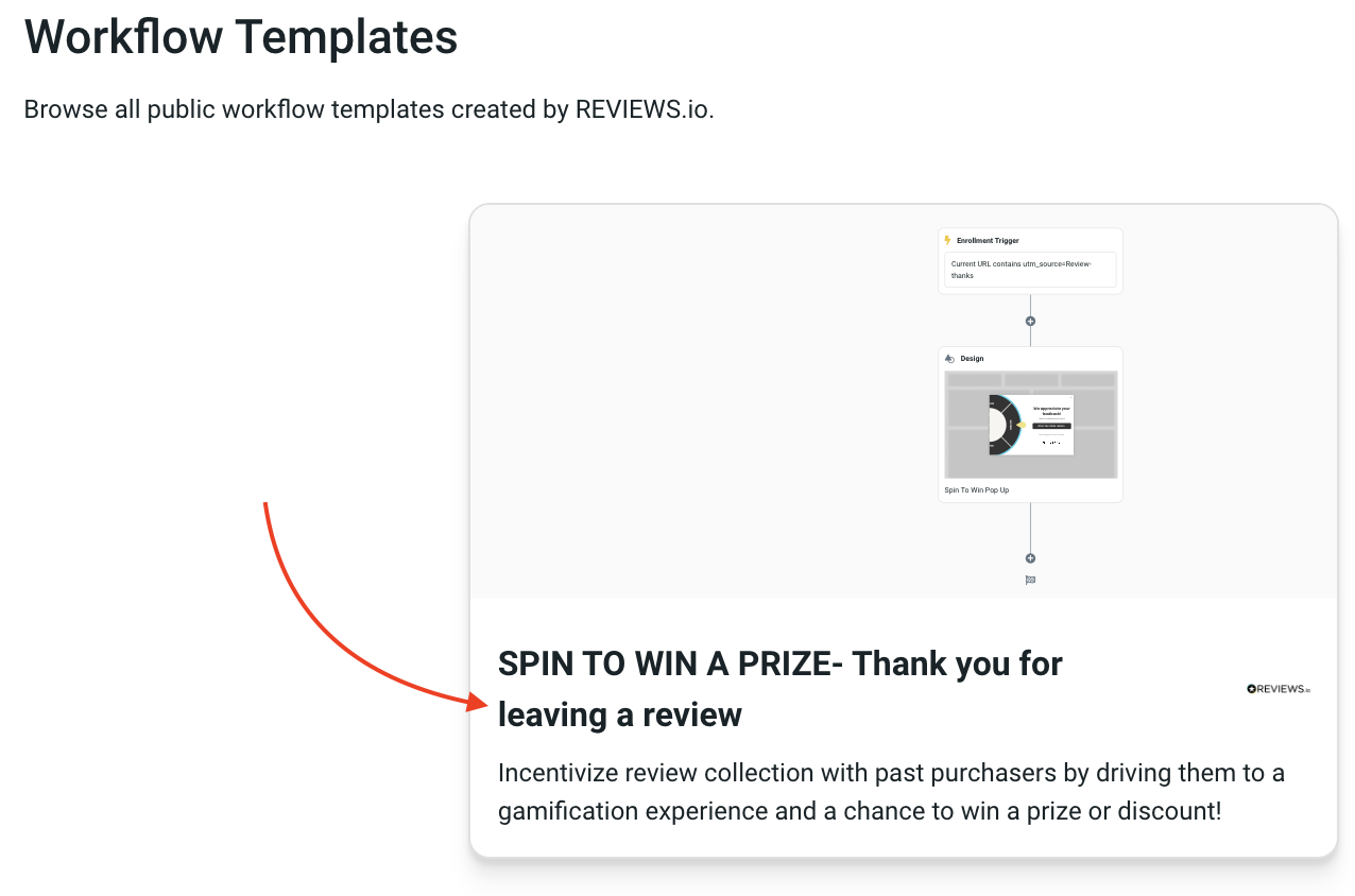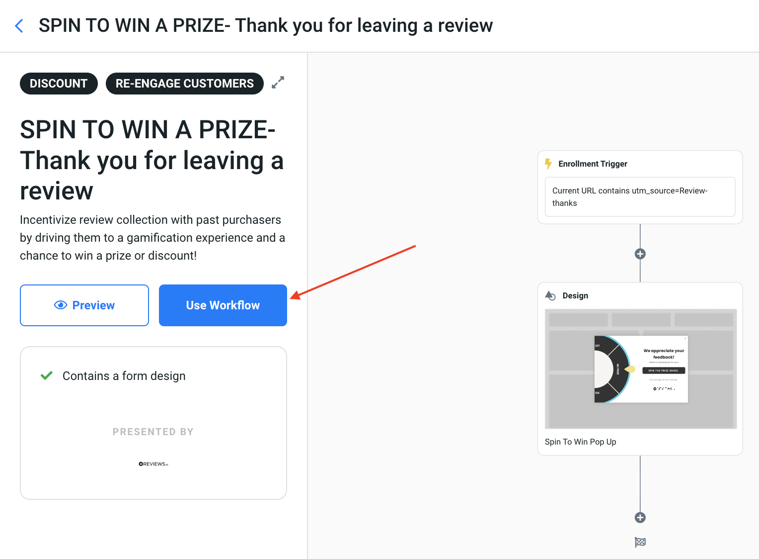 1. Go to the Reviews.io Partner view and add this workflow to your account: SPIN TO WIN A PRIZE- Thank you for leaving a review