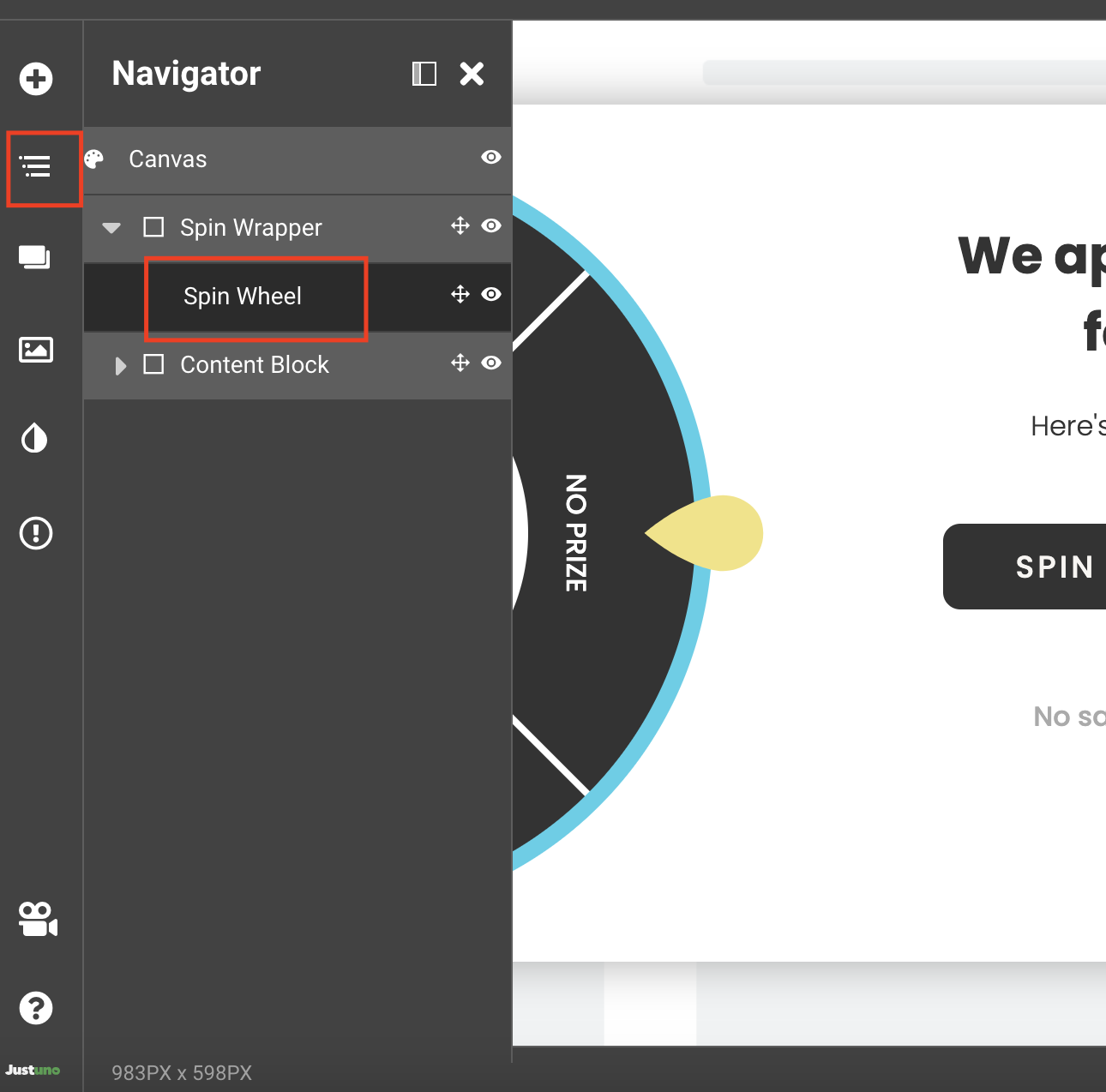 b. Click on the Layer Navigator from the left-side navigation options. Select the Spin Wheel layer to edit your spin wheel design. This will open up a right-side flyout with options to edit your wheel.