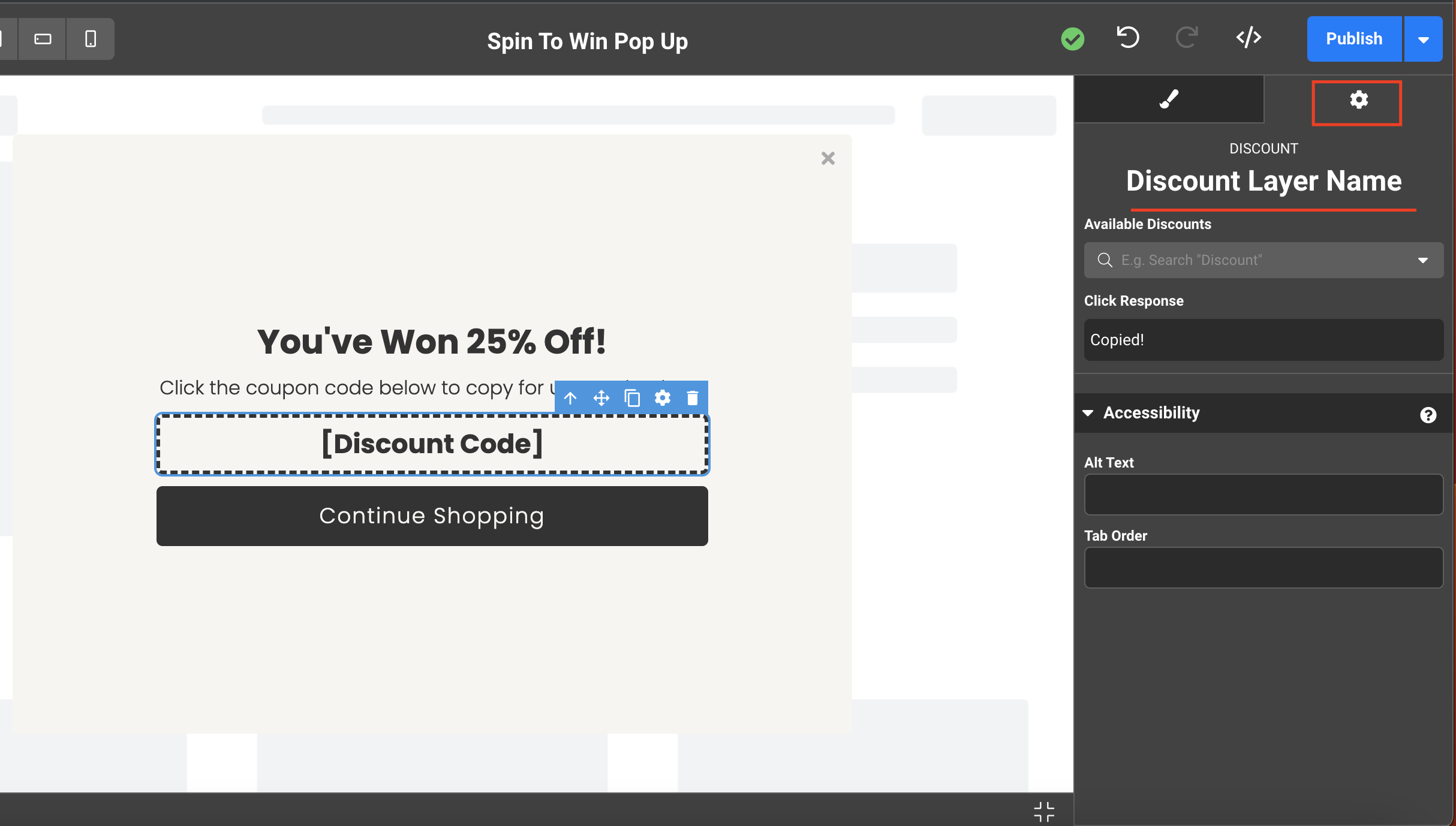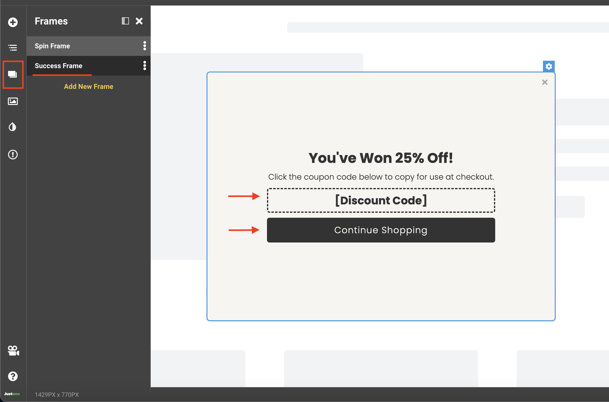 d. Click on the Frames tab from the left-side navigation options and select the Success Frame layer to edit your buttons and design. Click on the Discount code layer and Continue Shopping layer to open up the settings options on the lefthand side.