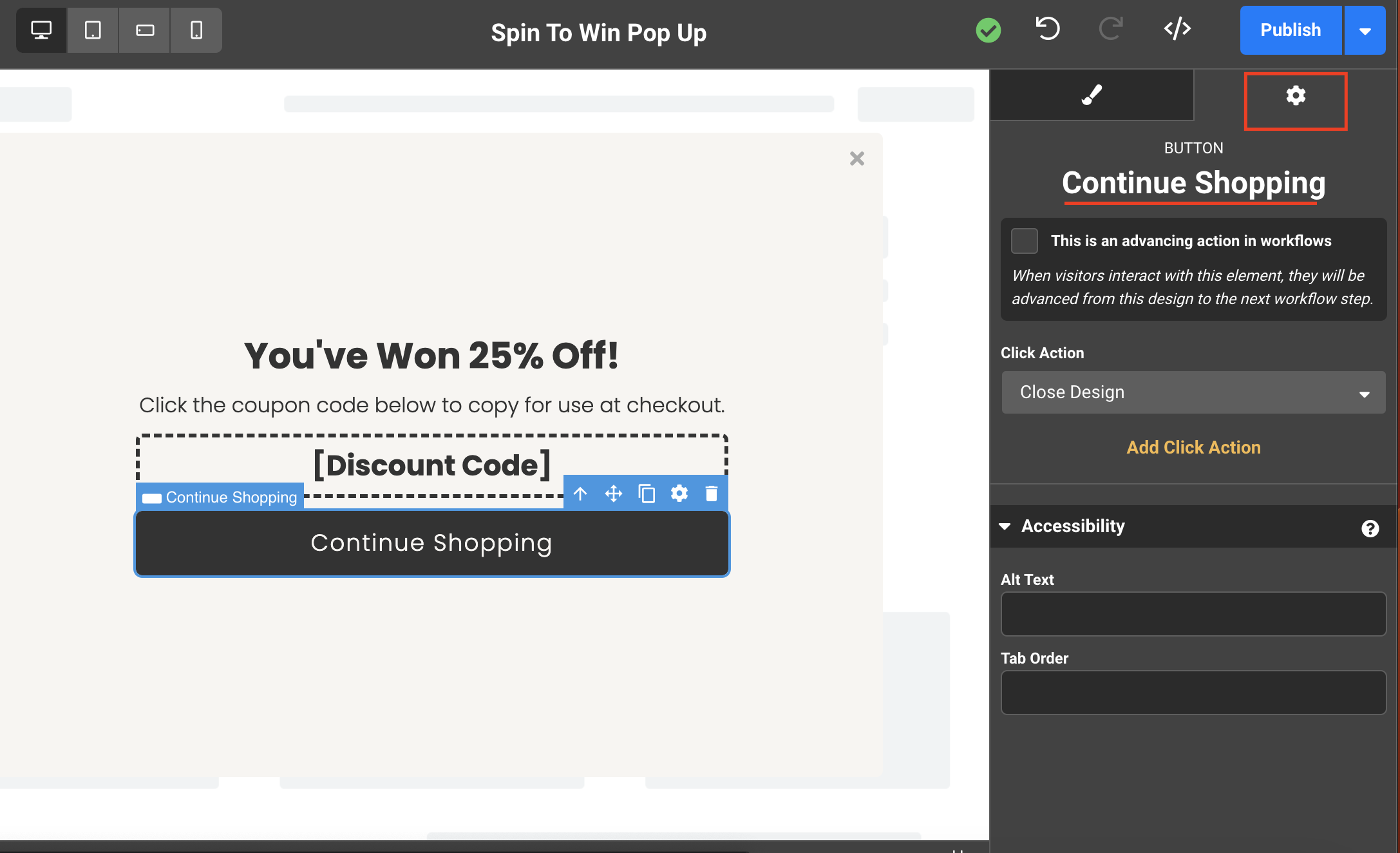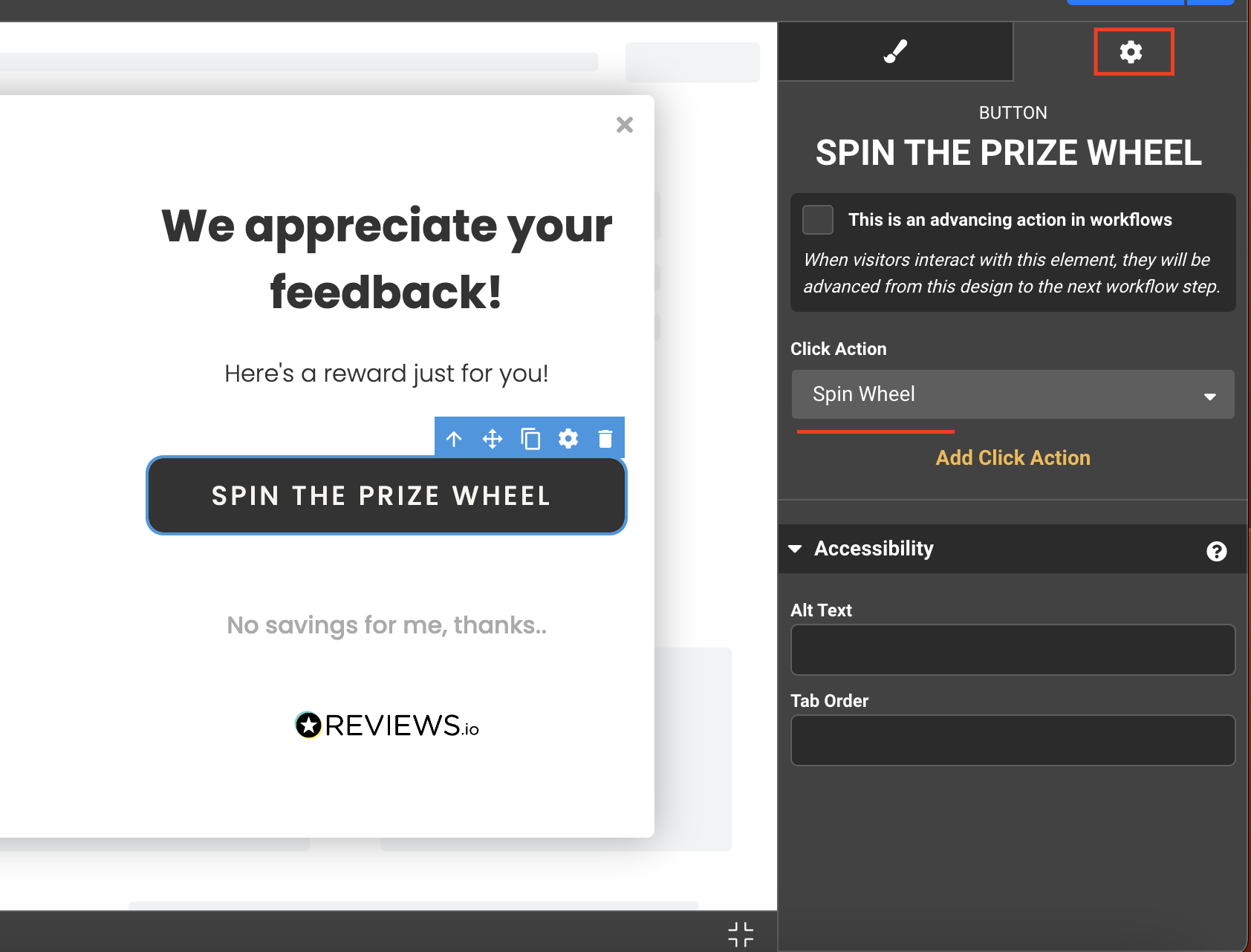 Note: your settings will already be set to the correct Click Action Spin Wheel, but you can always add click actions to the button.