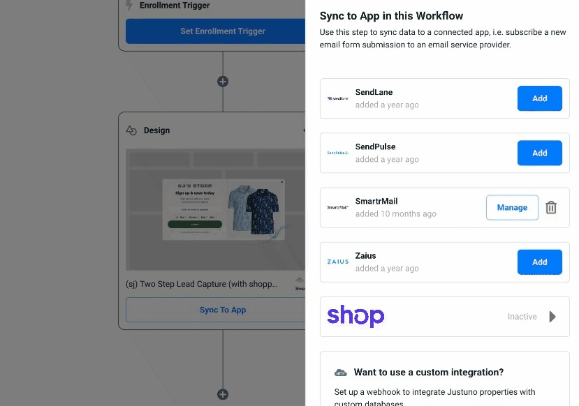 - Connect your SmartrMail account to Justuno (learn how to do that here). Once SmartrMail has been authenticated, go to your desired workflow, and click Edit Workflow. Once in the workflow builder, click the design step containing the form you wish to sync.