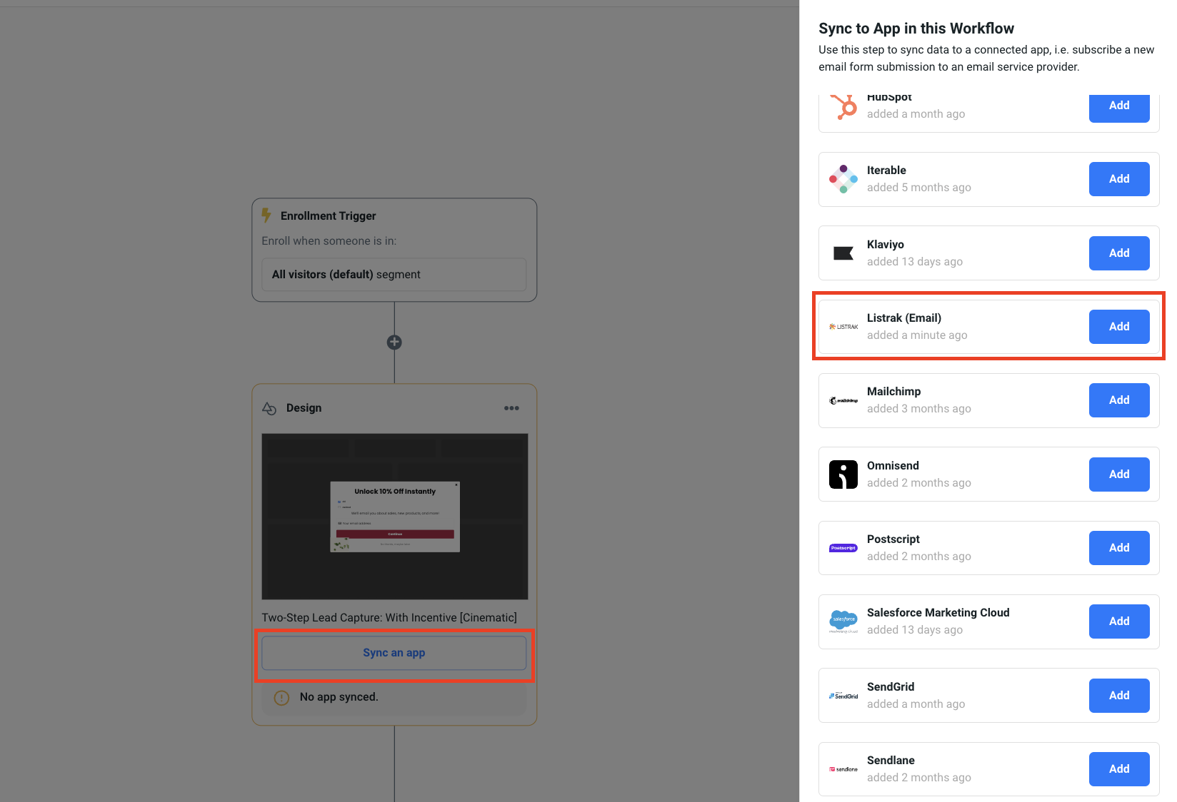 Now to the workflow. In the design step of the workflow, select the Sync to App option. In the side menu, find the Listrak app and click on Add.