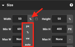 Note: Width and height inputs can be adjusted using four primary units of measurement. Using variable units will also ensure a more responsive design.