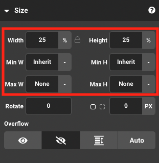 While working on a design, Size can be found by clicking a container and navigating to the Size section on the right-hand side menu. Here you'll be able to make any adjustments to the physical size of the selected container.
