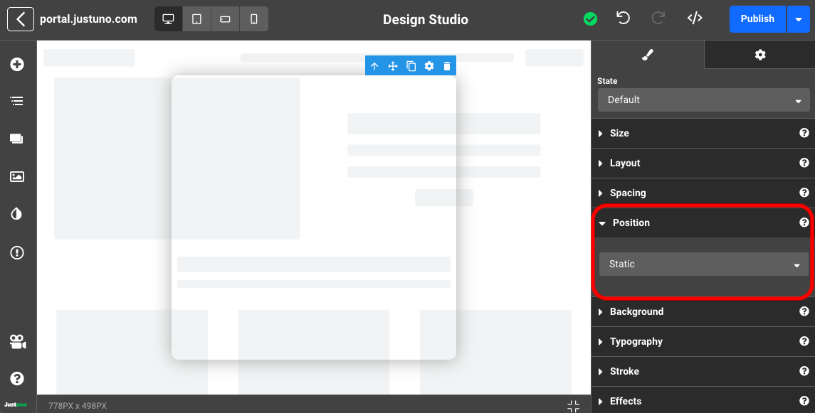 While working on a design, Position can be found by clicking a container/element and navigating to the Position section on the right-hand side menu. Position allows you to make individual adjustments to the positioning of your elements.