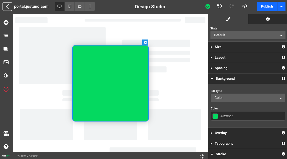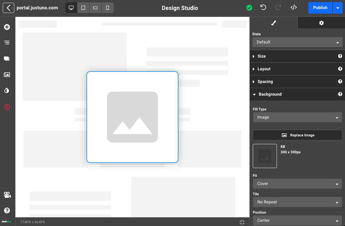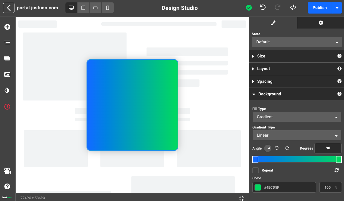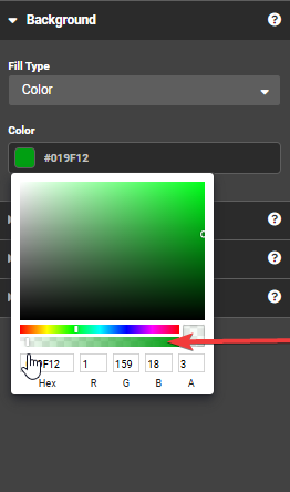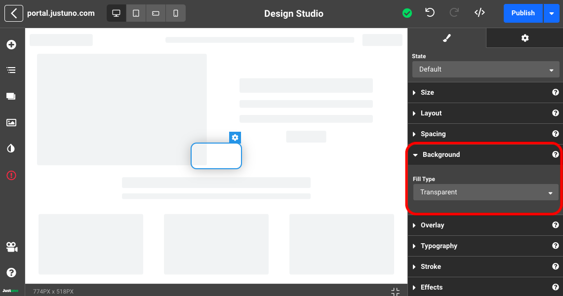 While working on a design, Background can be found by clicking a container and navigating to the Background section on the right-hand side menu. This area allows you to modify the background of the selected container. Select between four different fill types: Transparent, Color, Gradient and Image.