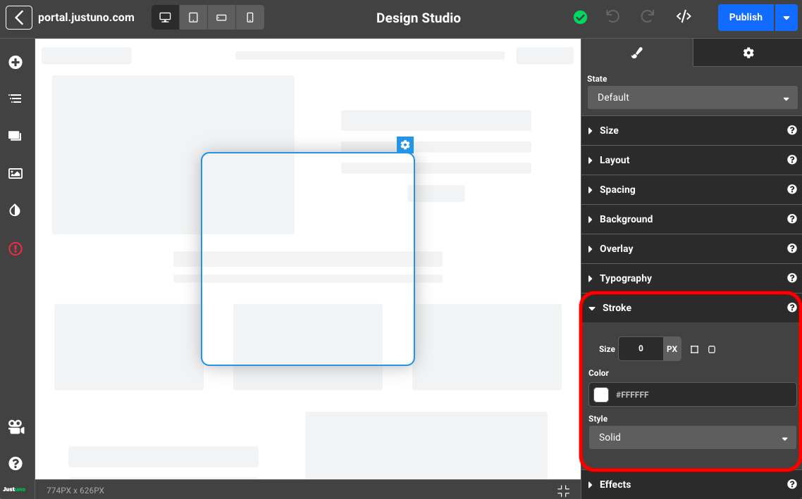While working on a design, Stroke can be found by clicking a container and navigating to the Stroke section on the right-hand side menu. Stroke enables you to add and style the border around the selected container.