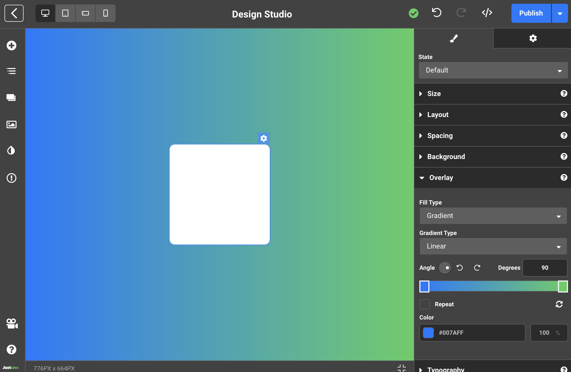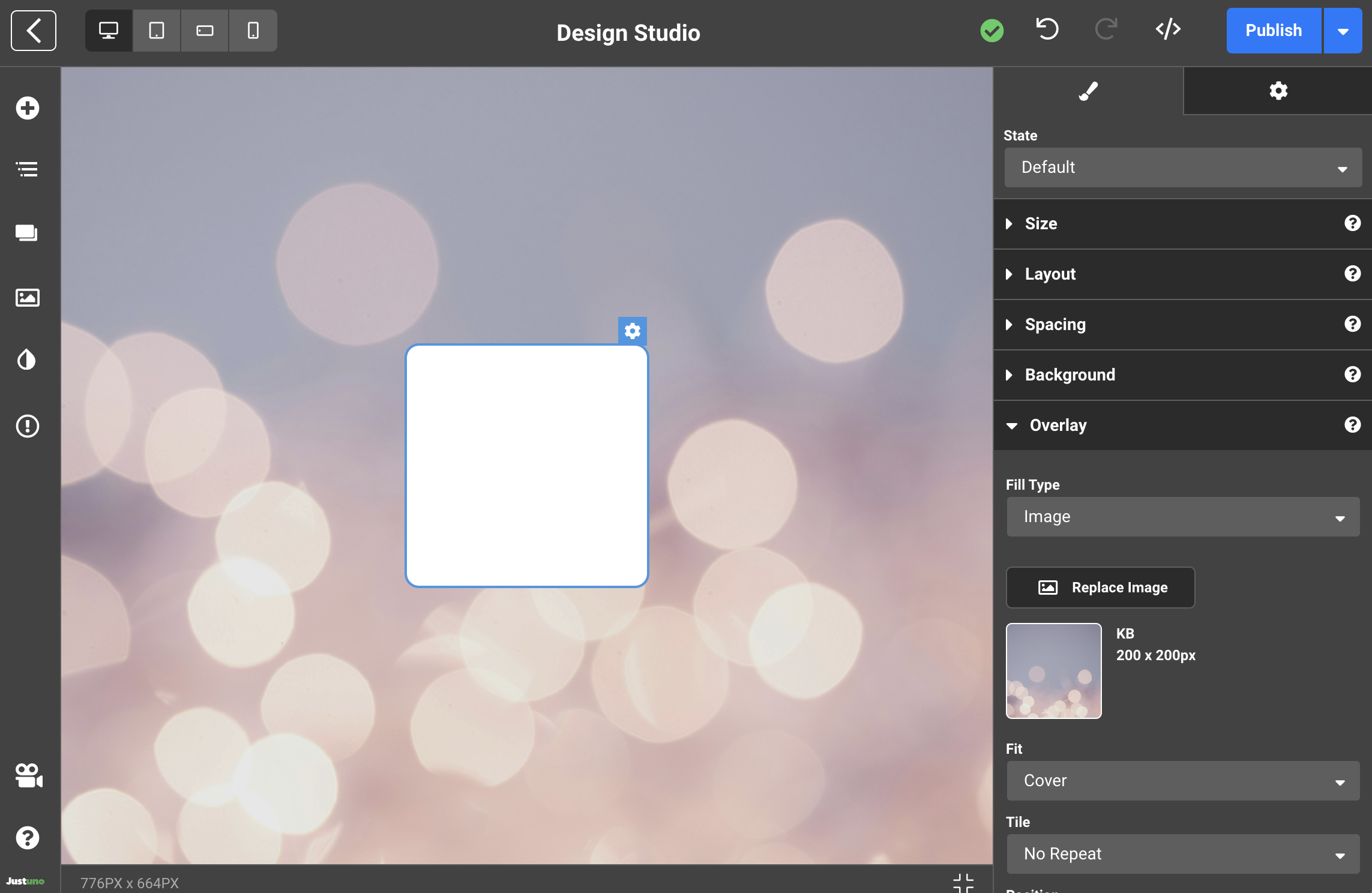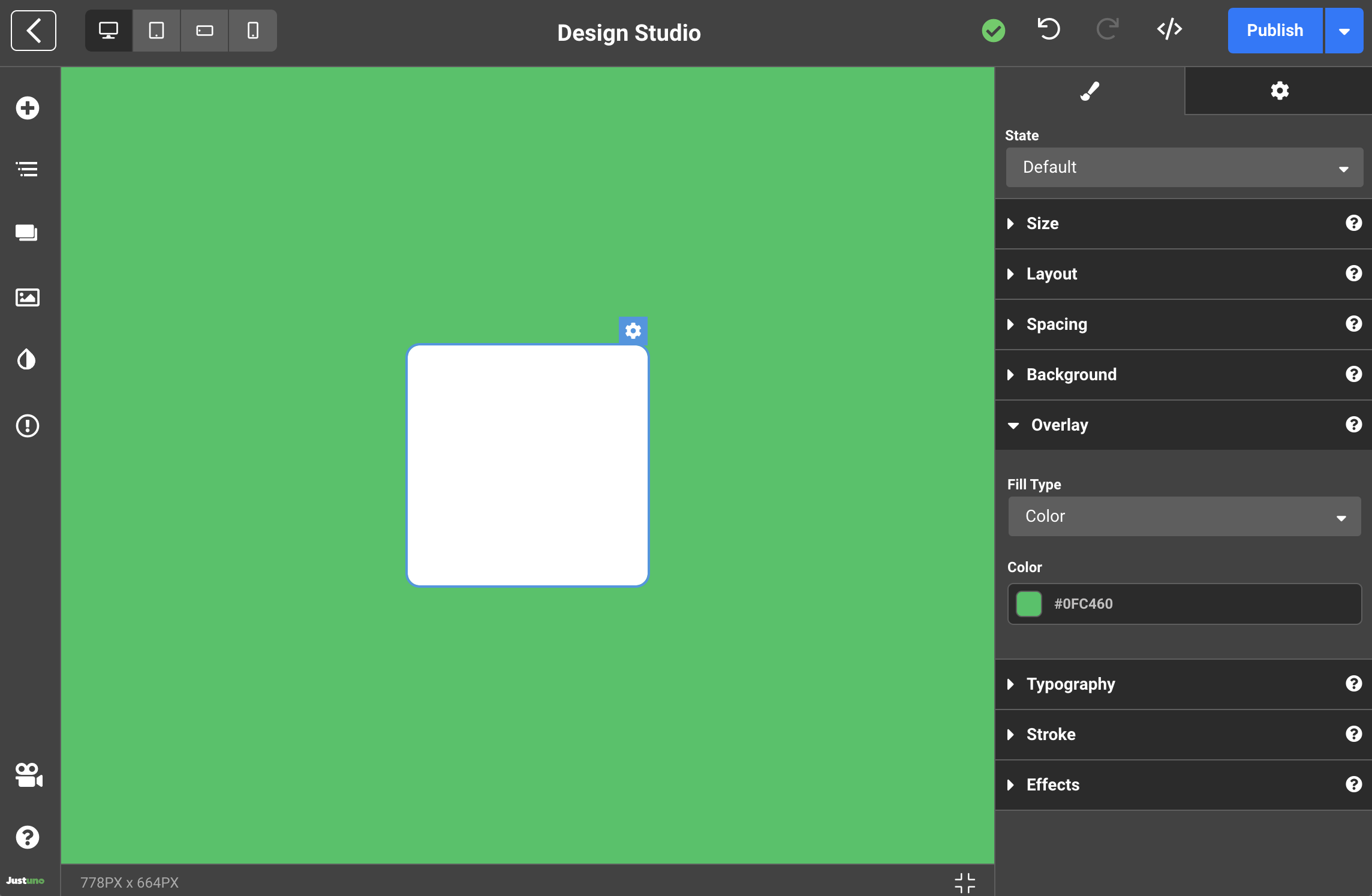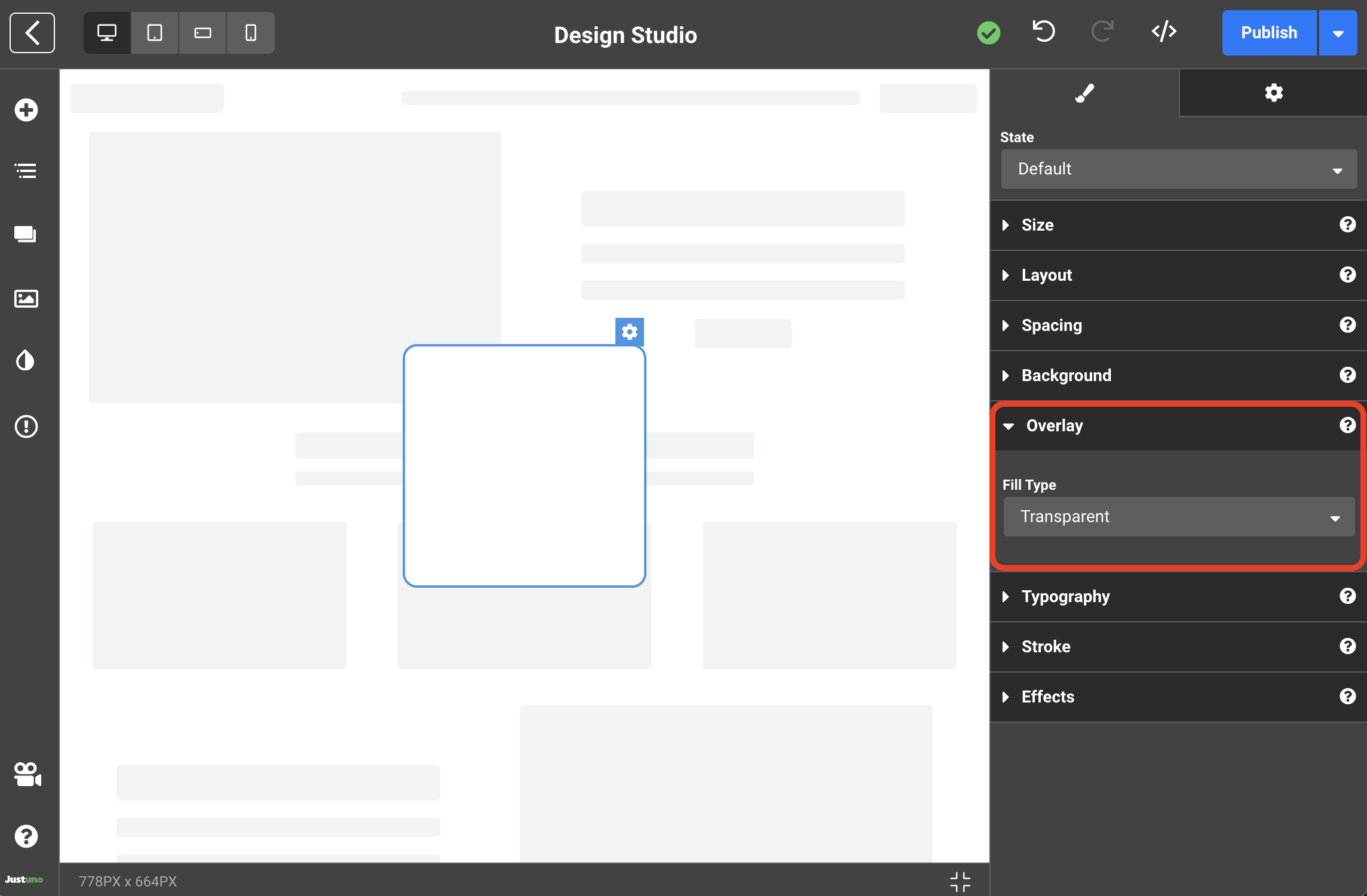 While working on a design, Overlay can be found by selecting the base canvas layer and navigating to the Overlay section on the right-hand side menu. This area allows you to add a background behind your design, creating a level of separation from the website that helps spotlight your designs. Select between four different fill types: Transparent, Color, Gradient and Image.