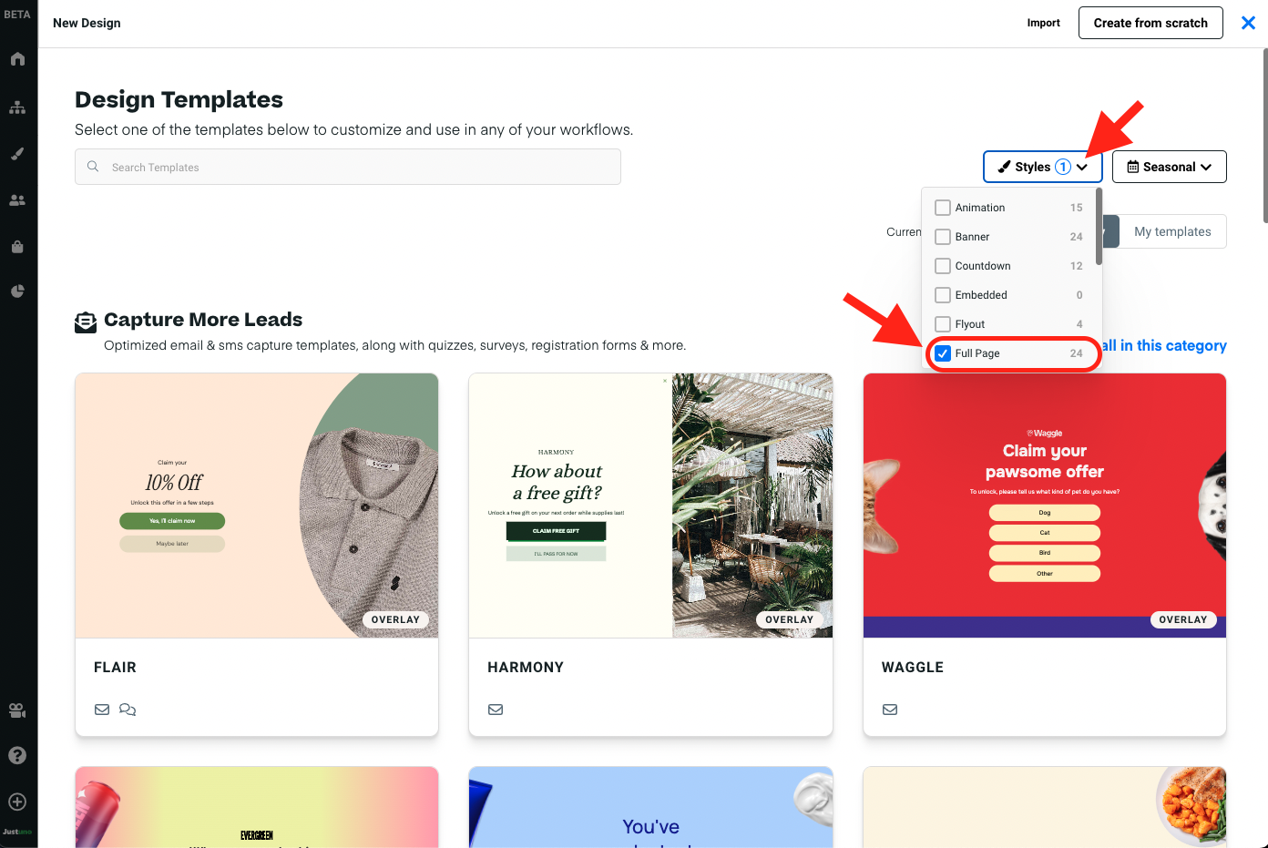 Tip: You may choose to use one of many full-page templates already made available within Justuno. When searching from the design template library, select the style filter "Full Page".