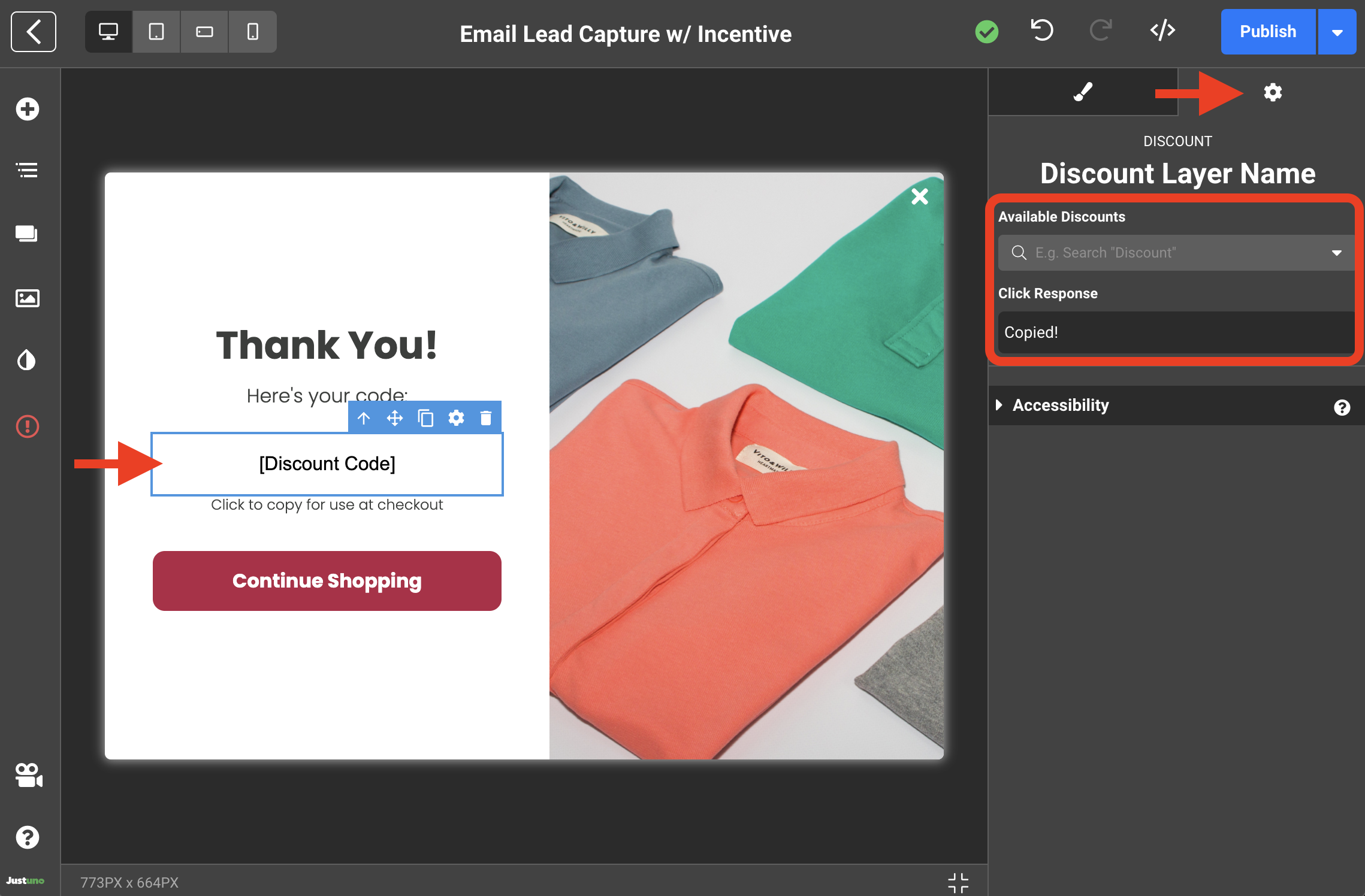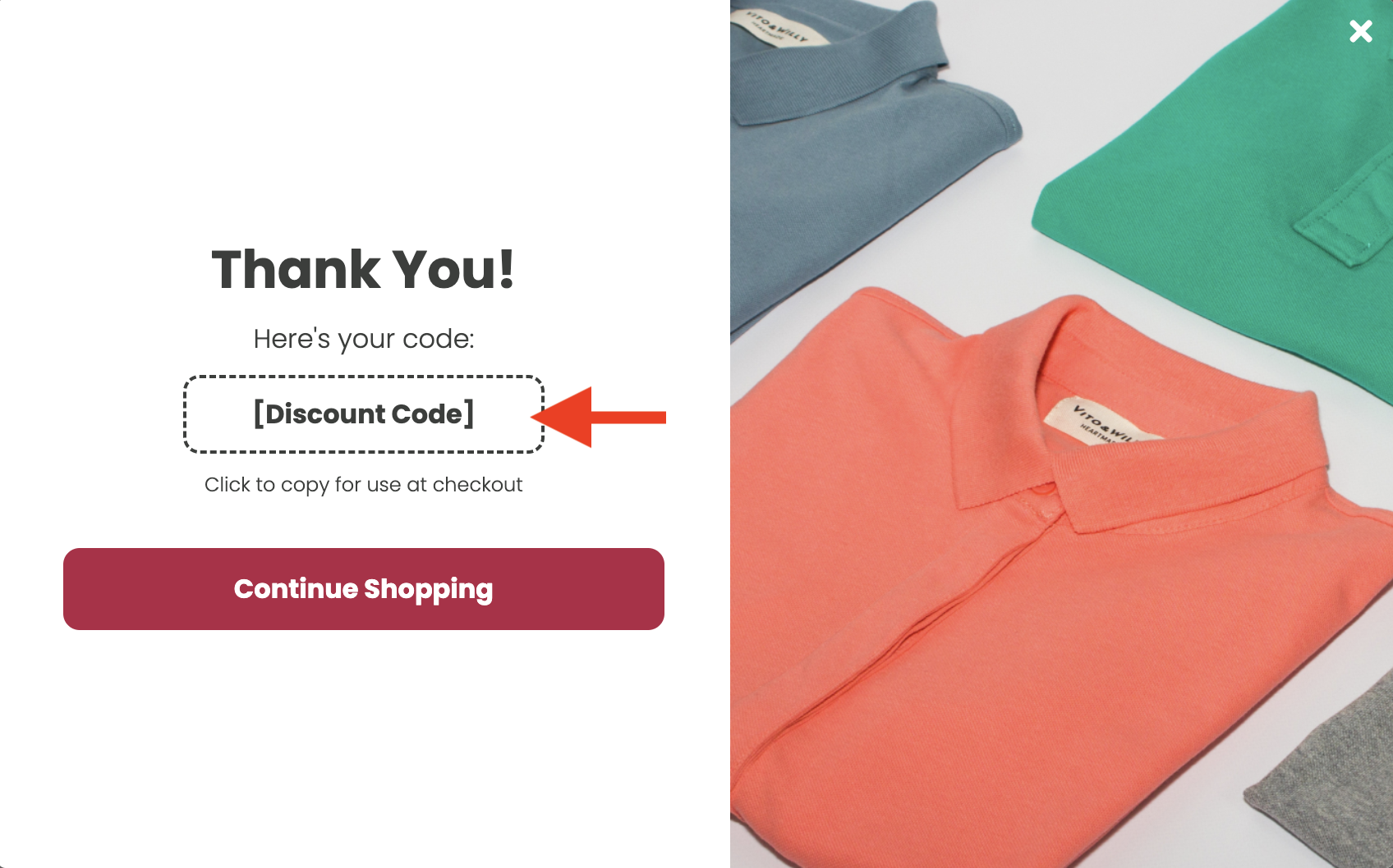 Incentivizing your website visitors with a coupon or discount code will often allow you to reach a higher engagement rate on your lead capture forms. Once you've crafted the right motivational message on the opt-in step, you will need to add a discount element to the subsequent confirmation screen.