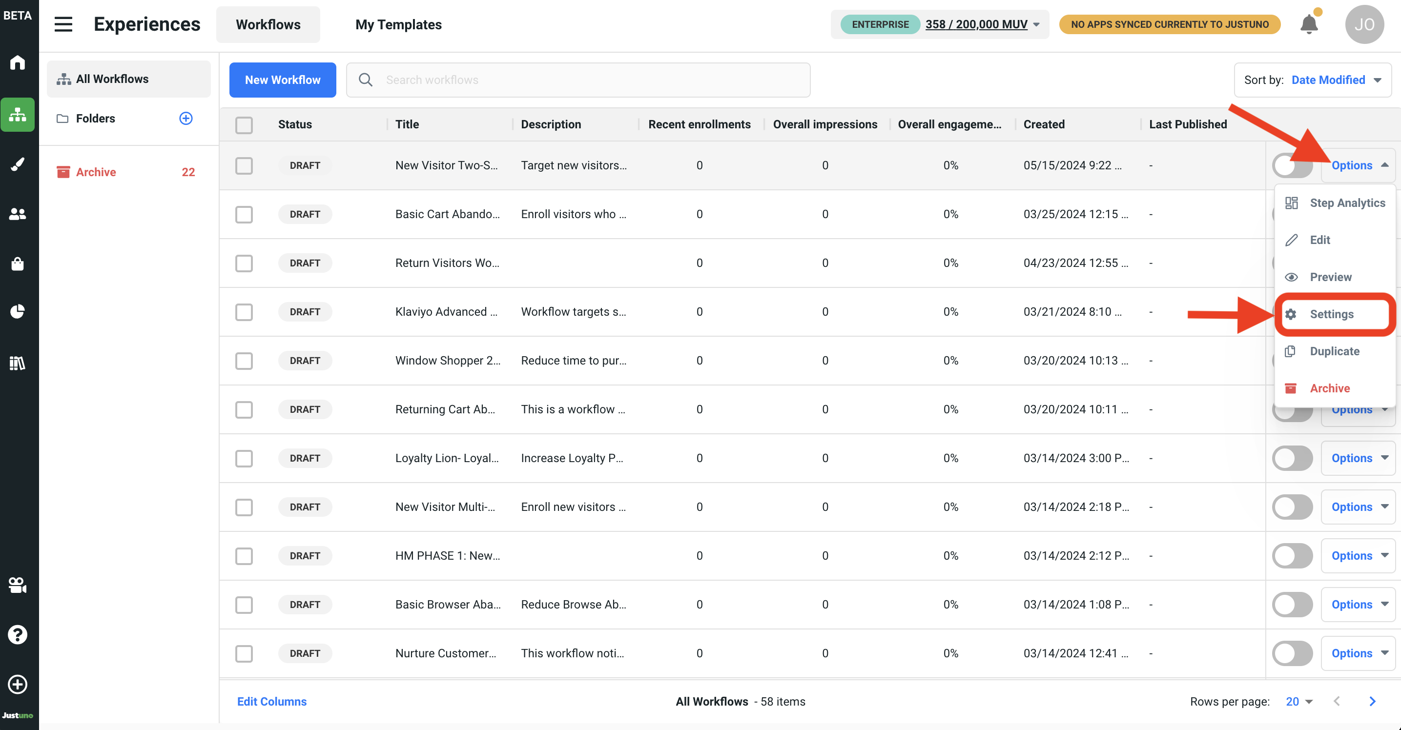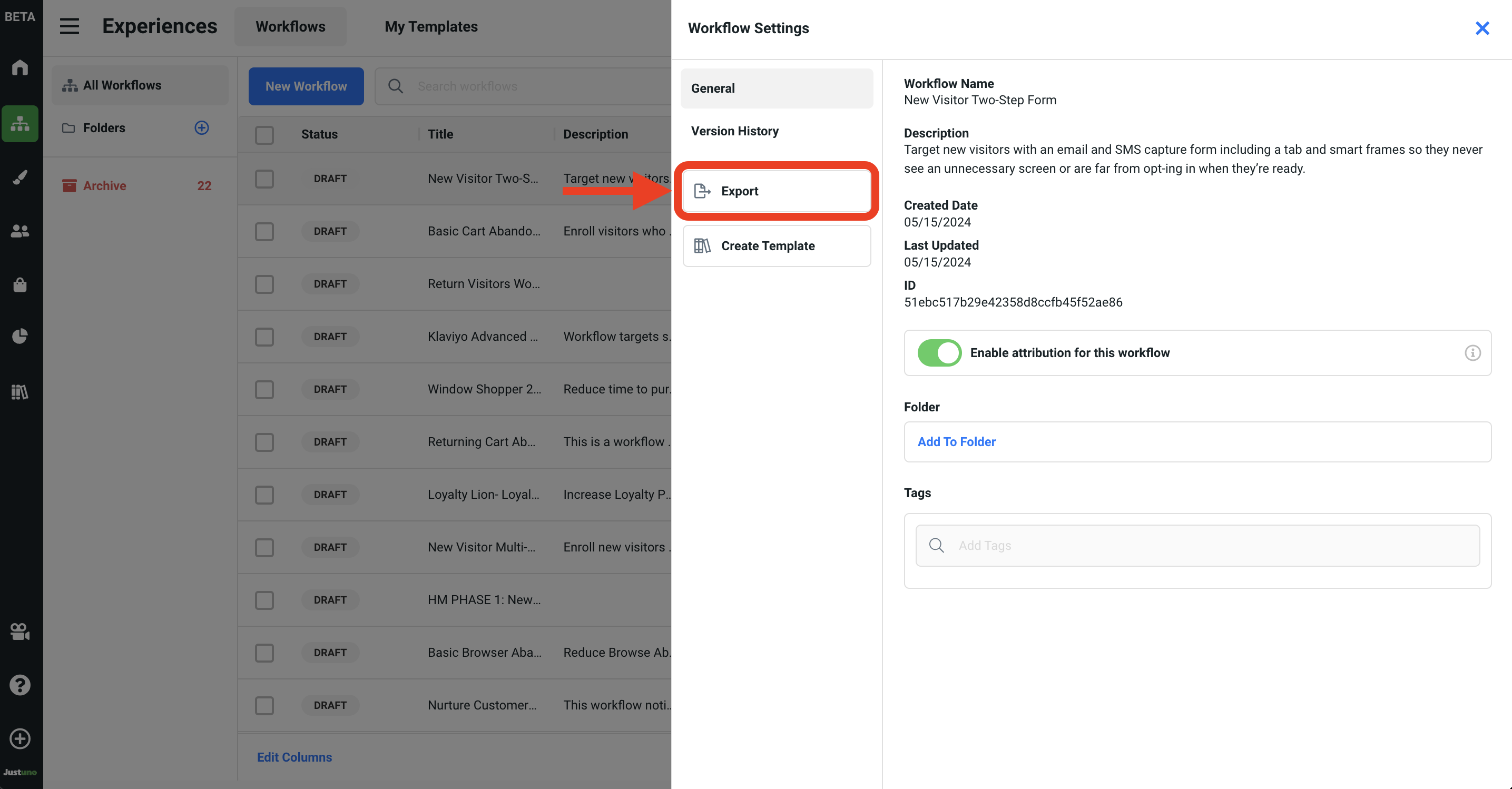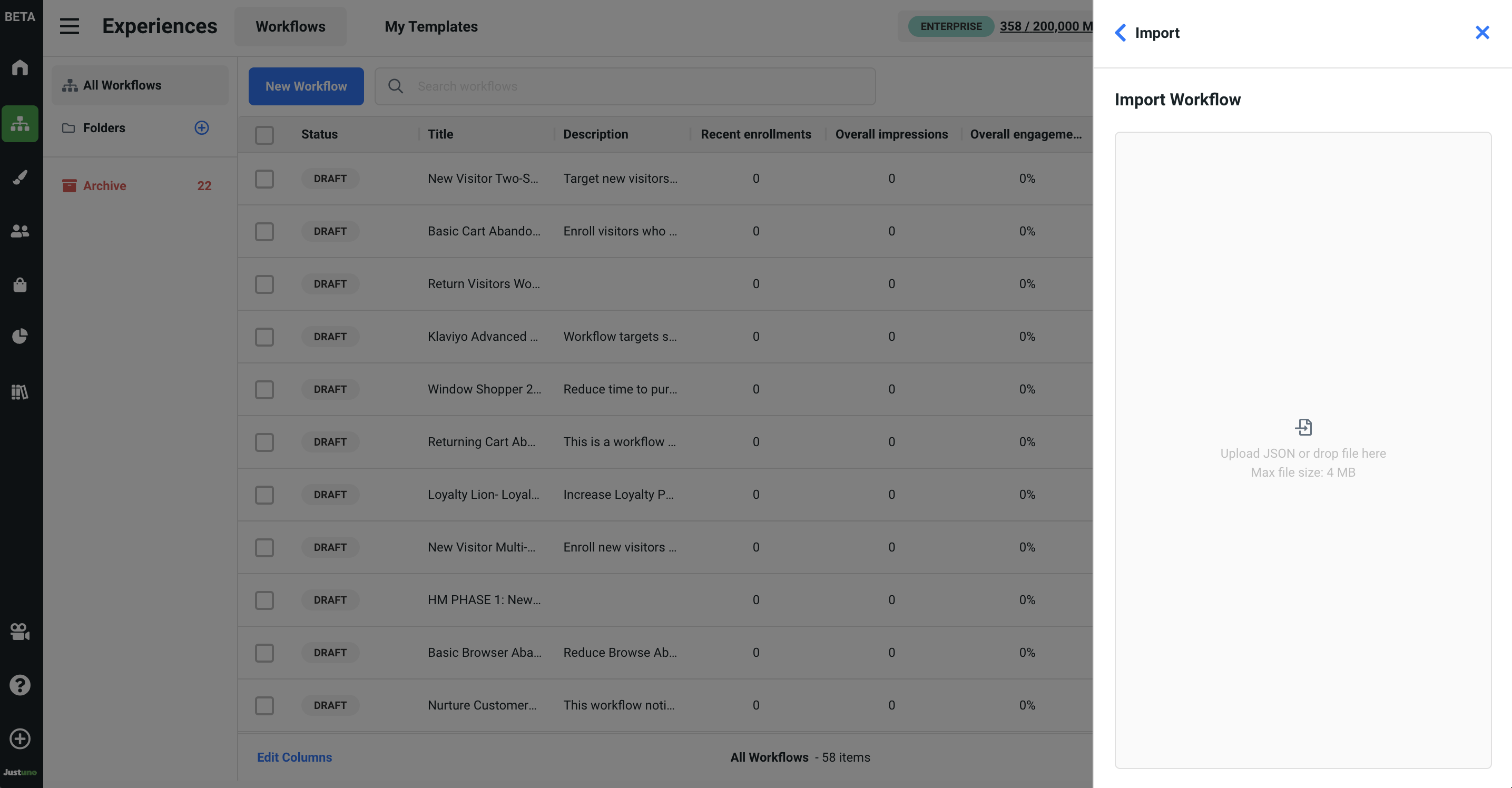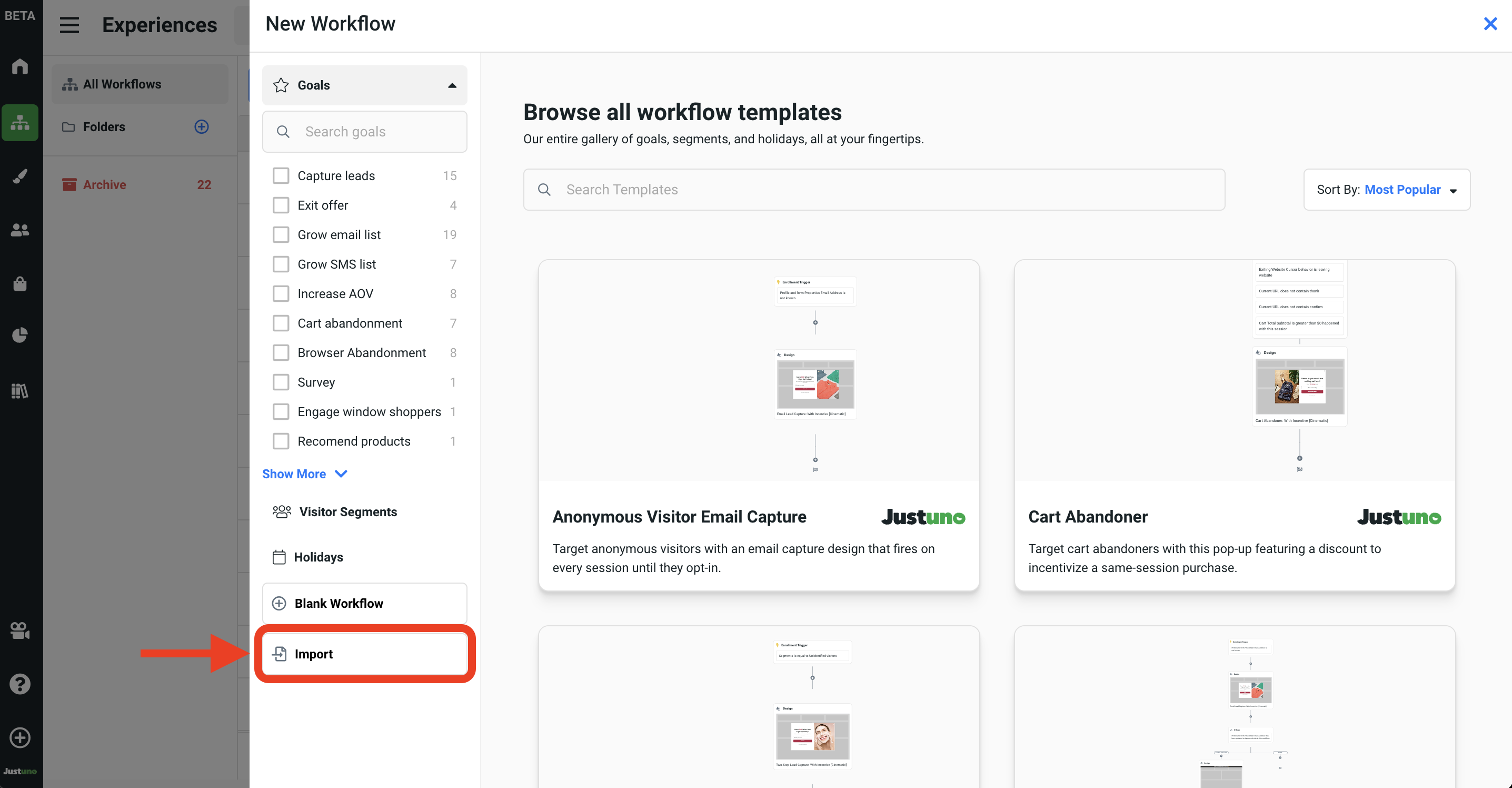 This Justuno support article will walkthrough the steps on how to import/export your designs and workflows.