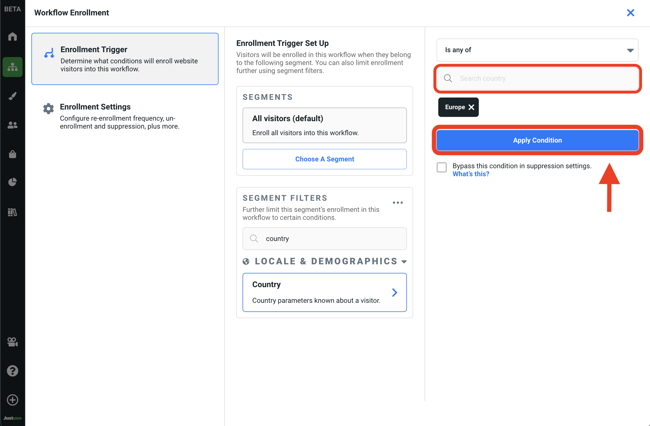 4. Here you will specify the country of which you'd like to exclude or include for this workflow audience. For GDPR regulated countries, simply type and select Europe in the search bar. Hit Apply Condition.