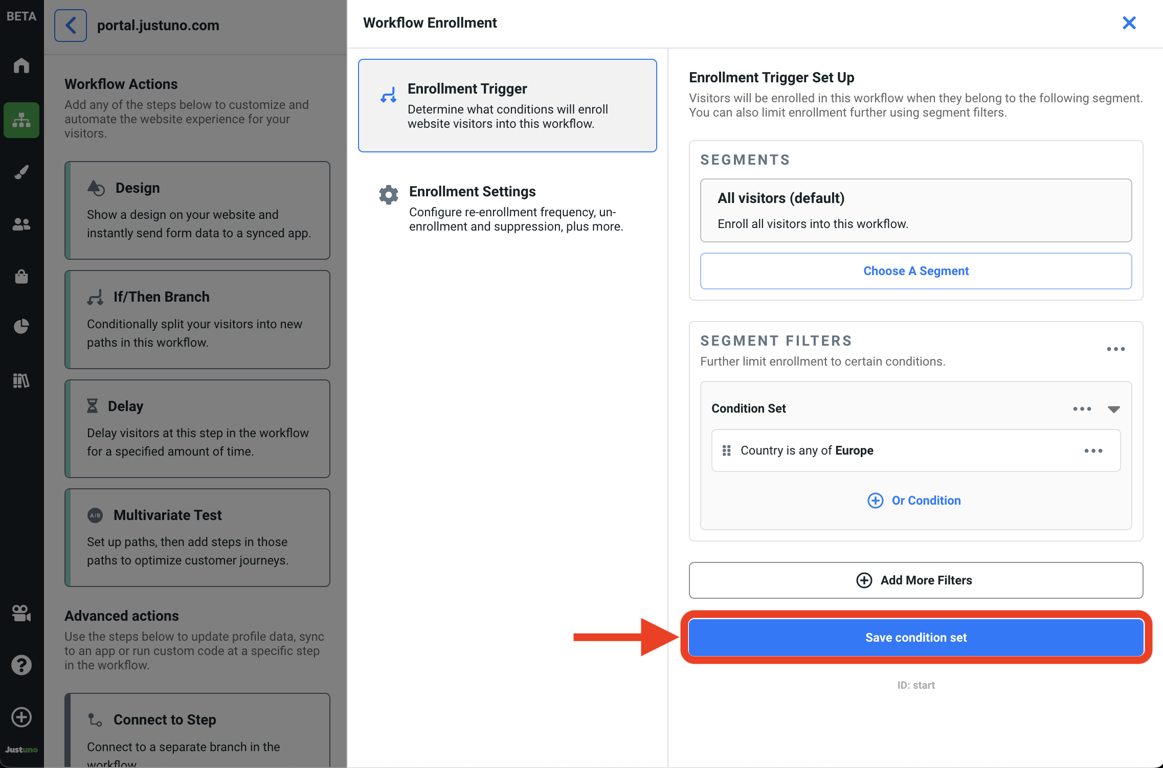 5. Add/update any additional segment filters wherever you see fit and hit Save condition set.