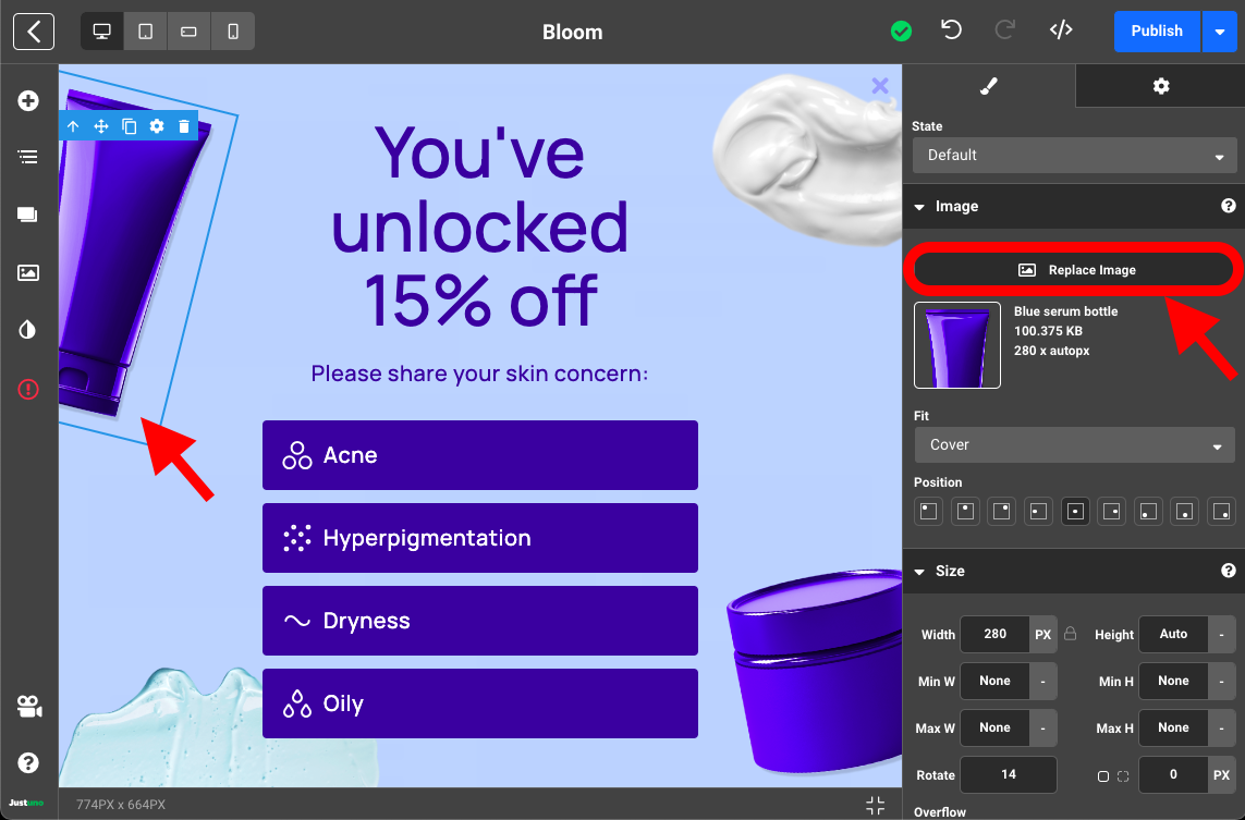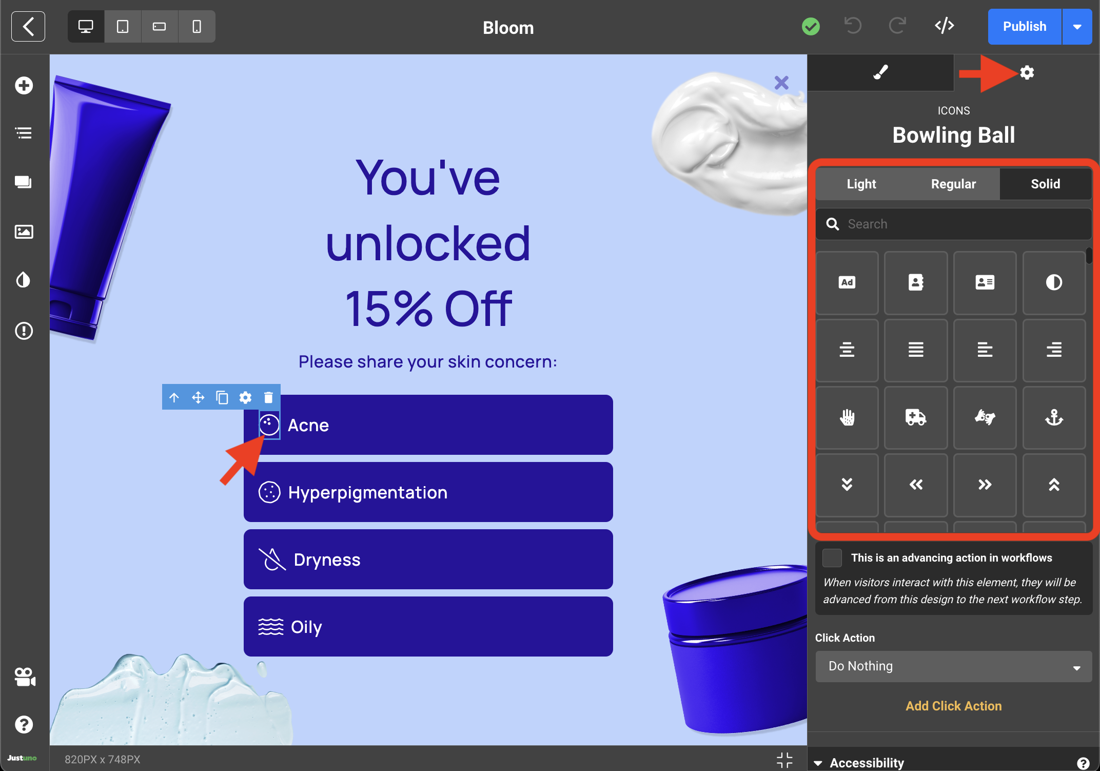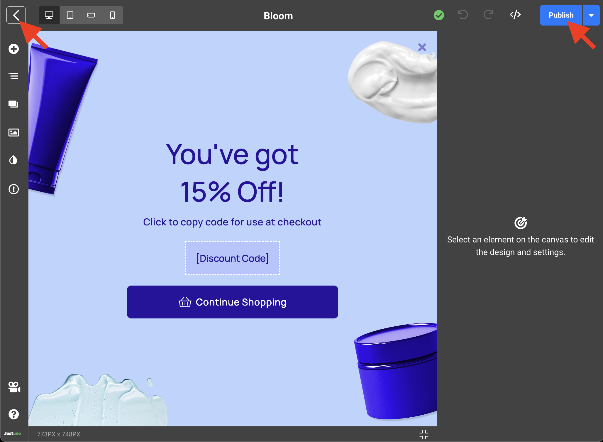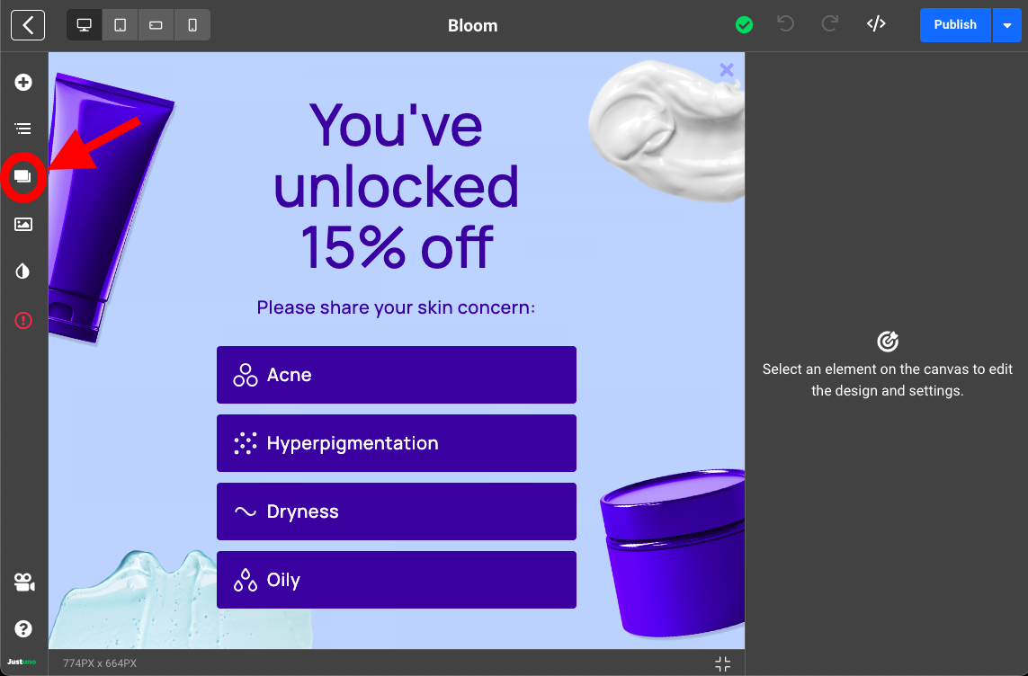 - Inside the Design Studio, you can select any element on the design canvas to reveal a plethora of customization inputs for that specific element. We recommend updating the text copy and the image(s) to reflect your website branding. You can also utilize our native button icons which can be accessed by selecting any icon element and navigating to the settings tab on the right side menu.