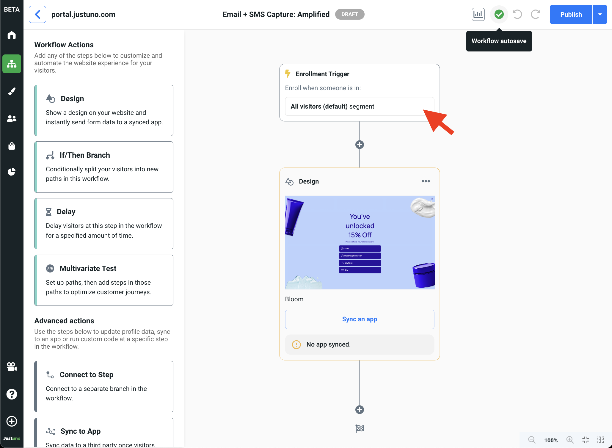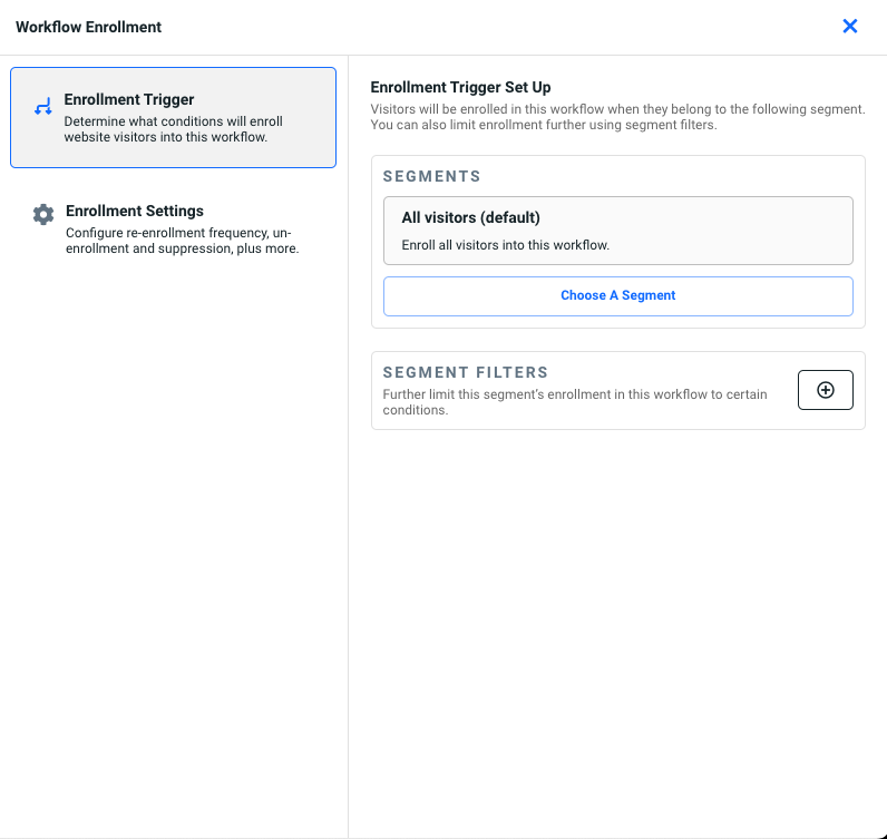 Your enrollment trigger controls the target audience for your workflow. By default, the Email + SMS Capture: Amplified workflow targets: