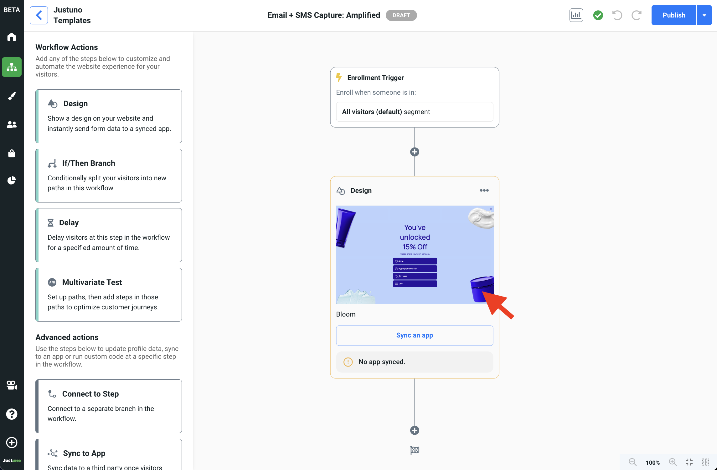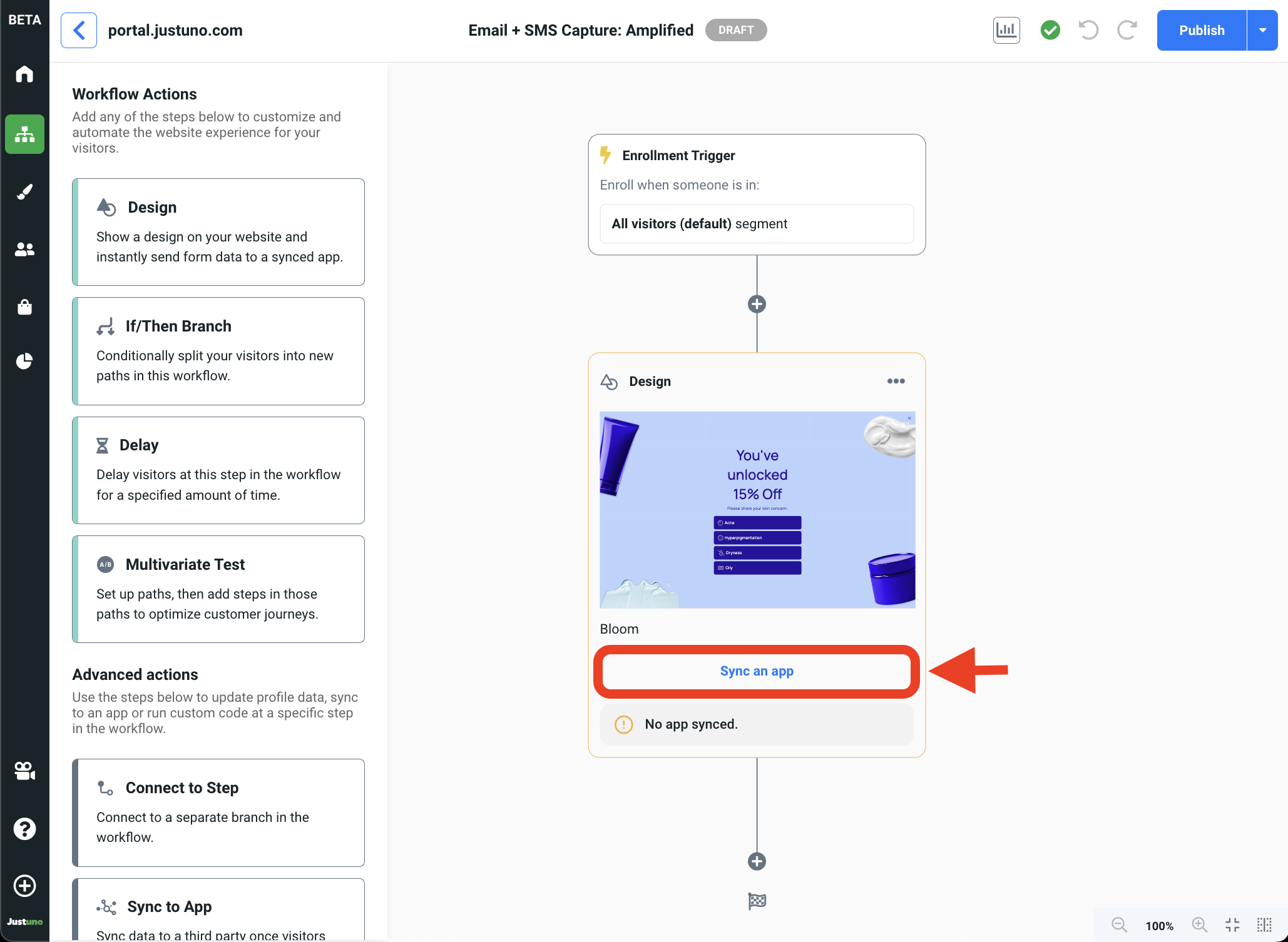 - Now that your design is ready. You will need to snyc your design with your marketing stack. This will allow Justuno to push the information captured in your design (i.e. shopping interests, email & phone number) to a third party application of your choice. Click the Sync an app button on your design to reveal the sync to app module.